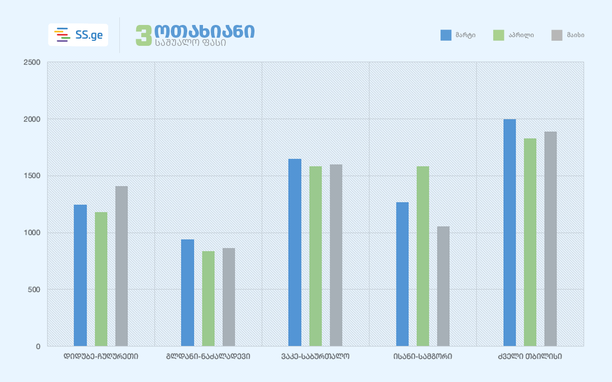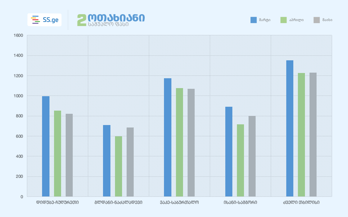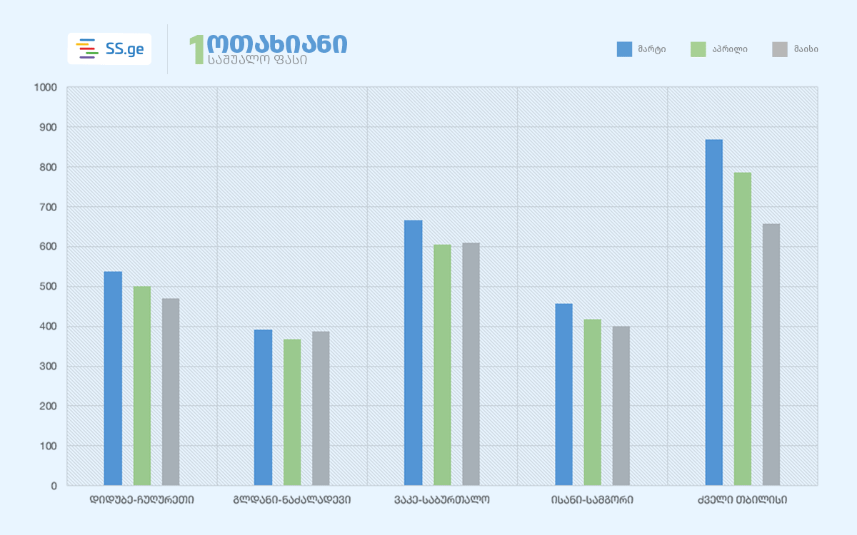 როგორც SS.ge-ს კვლევა აჩვენებს, მარტიდან მაისამდე 1-ოთახიანი ბინის გაქირავებაზე ფასი თითქმის ყველა უბანში შემცირდა. კერძოდ, გლდანი-ნაძალადევში 6 ლარით, ვაკე-საბურთალო - 56 ლარით, ისანი-სამგორი - 57 ლარით, ხოლო ძველ თბილისში - საშუალოდ 210 ლარით შემცირდა.