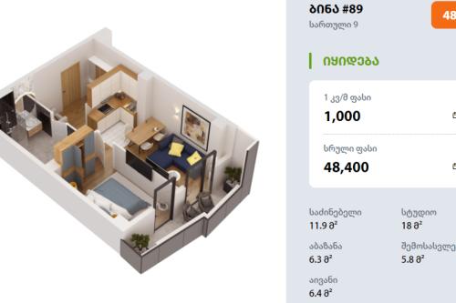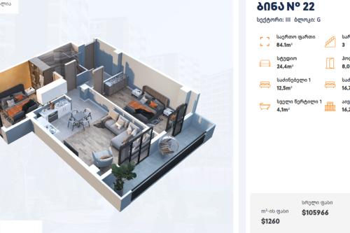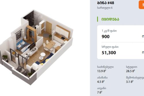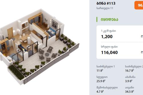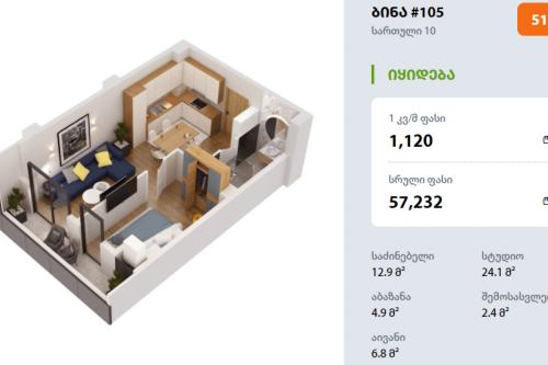 შეიძინეთ ბინა სააქციო ფასად. 106 392$ის ნაცვლად 97 812$ად.პროექტი სრულდება 2024 წლის ბოლოს. ბინა ბარდება თეთრი კარკასის მდგომარეობაში. პროექტის ფარგლებში აშენდება აუზი კორპუსებს შორის, რომელიც იქნება საერთო მოხმარების, შიდა ტერიტორიაზე გადაადგილება შესაძლებელი იქნება მხოლოდ ფეხით.შესაძლებელია შიდა განვადებაც.