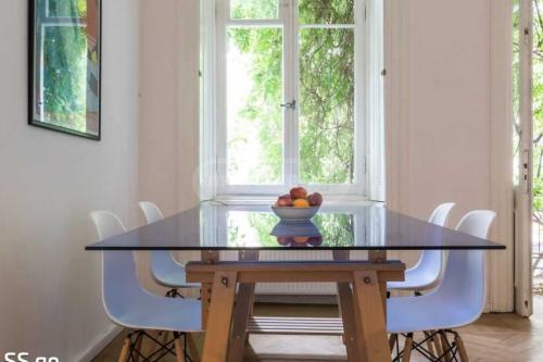 Large bright south facing apartment with balcony in historic house. The house was built in 1905 and thus has the status of a monument. Large room 45m2, bedroom 13m2, dining room 18m2, kitchen 10m2, bathroom toilet 10m2. 4 meter ceiling height. Original sash windows and oak floors. garage. Basement 30m2. High second floor.