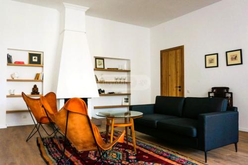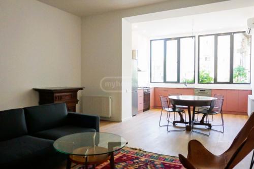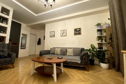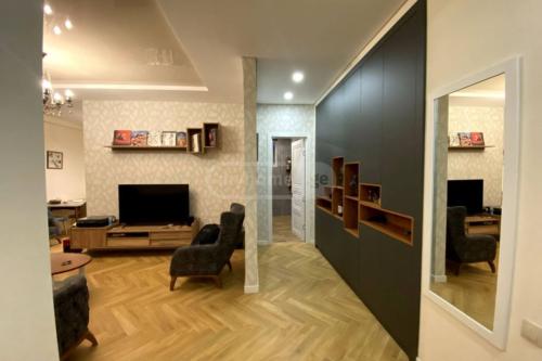 (Auto Translate!) Newly renovated 3-bedroom apartment at Uznadze 79 near the Marjanishvili Theater, in the so-called Stalin's House the apartment has a 4 sq m balcony and a fireplace.... it has parking spaces in the fenced yard. The yard is greened with perennial trees, where there is a children's playground/space. The apartment has a balcony.