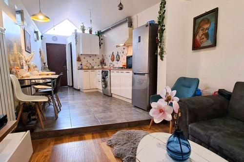 Studio type private house for immediate sale. with a small yard, parking space. It has a 10-square meter basement and an attic that can be used for storing things. You can also make a mezzanine. The house has high ceilings with mansard roof, bright rooms. It is suitable for living as well as an art workshop and studio. It is very promising for rent. Only built-in furniture and appliances remain in the apartment. There is central heating and all communications.