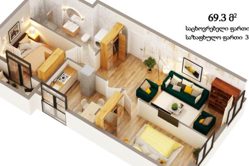 Gldani residential complex is distinguished by a comfortable, cozy location, where you will find: quiet environment, open space, fresh air, beautiful panoramic views. The residential complex is located near the metro station "Akhmeteli Theater" (5 minutes by car, 15 minutes by foot). The residential complex consists of two blocks: A and B. Comfortable apartments are perfectly designed - all rooms have windows and balconies. The project envisages a paved and green yard. Residents have both an above-ground and an underground parking lot at their disposal. Delivery conditions: green frame • plastered walls • stretch floor • metal-plastic doors and windows • iron entrance door • networked communication points in the apartment • heating pipes • 5 e-mails in the room. Point • The construction of the tiled balcony project has been completed. It is possible to start the internal repair work in the apartment immediately after purchasing the apartment.