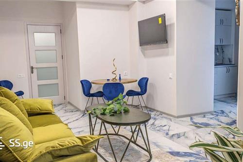 FLOWER hotel apartment for rent in the prestigious area of Sololak, on Asatiani Street, is a newly renovated two bedroom, one of which is a master bedroom with a jacuzzi, central heating, two bathrooms, two air conditioners, two balconies.