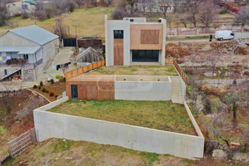 The highest quality residential house in Shindis! Located 10 minutes away from the city, the house is built with the highest quality materials. The house and the yard are completely finished. The house is covered with natural stone, concrete processing and wooden beams. Swimming pool, irrigation systems, garage (with electric door)