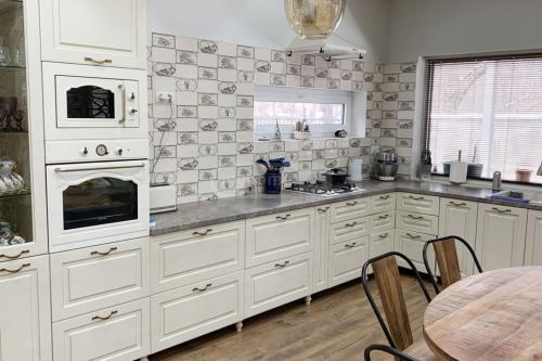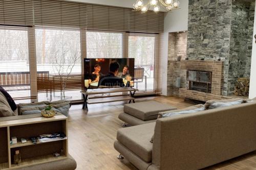 A new 2-storey house (built 4 years ago) in the resort promzone. Each floor has a separate entrance. 5 bedrooms, 3 bathrooms. Also available for guests. 2 kitchens, 2 living rooms. Central heating. There is a working fireplace in the house. Parking for 2 cars. e-mail In case of power outage, there is a generator in the house. The house was built and decorated by a famous architect. There is a large room between the floors. (useful for cinema, etc.) There are supermarkets and pharmacies near the house.