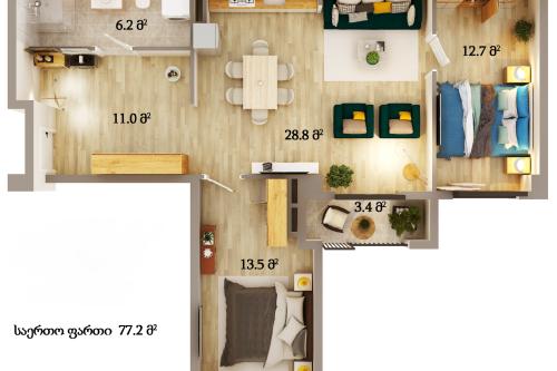 The residential complex is located near the metro station "Akhmeteli Theater" (5 minutes by car, 15 minutes by foot). The residential complex consists of two blocks: A and B. Comfortable apartments are perfectly designed - all rooms have windows and balconies. The project envisages a paved and green yard. Residents have both an above-ground and an underground parking lot at their disposal. Delivery conditions: green frame • plastered walls • stretched floor • metal-plastic doors and windows • iron entrance door • networked communication points in the apartment • heating pipes • 5 e-mails in the room. Point • The construction of the tiled balcony project has been completed. It is possible to start the internal repair work in the apartment immediately after purchasing the apartment.