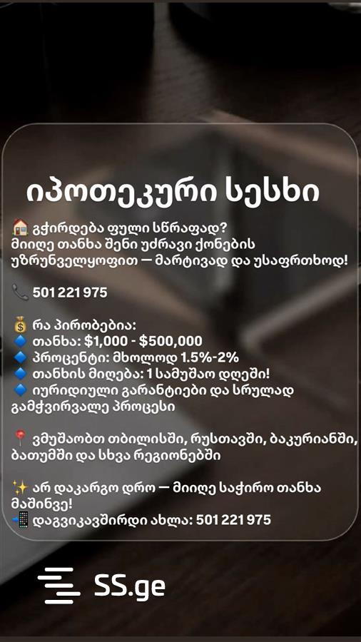 მიიღეთ თანხა თქვენი ქონების უზრუნველყოფით — მიწის ნაკვეთები, ბინები, კარკასული სახლები და სხვა უძრავი ქონება შეიძლება იქცეს თქვენი მოსახერხებელი გასაღებად, რომელიც ფინანსურ პრობლემებს დაუყოვნებლივ გადაჭრის!