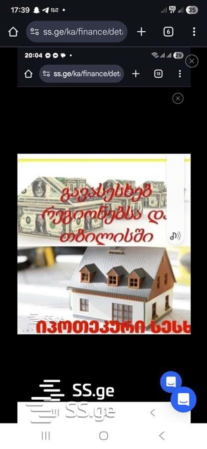 გავასესხებთ თანხებს 1.50..%დან 2.5%-მდე. თბილისის. საქართველოს. მაშტაბით ბინების, კერძო სახლების, თეთრი და შავი კარკასების, კომერციული ფართებისა და მიწის ნაკვეთების გარანტიით როგორც კერძო, ასევე საბანკო კლებადი სისტემით. გადავფარავთ როგორც კერძო იპოთეკარის ასევე ბანკებსა და მიკროსაფინანსო ორგანიზაციებს ჯარიმებისა და პირგასამტეხლოს გარეშე ვადა გადაცილებაზე . თანხას გავცემთ დოლარში. თანხა გაიცემა ერთ დღეში Show original