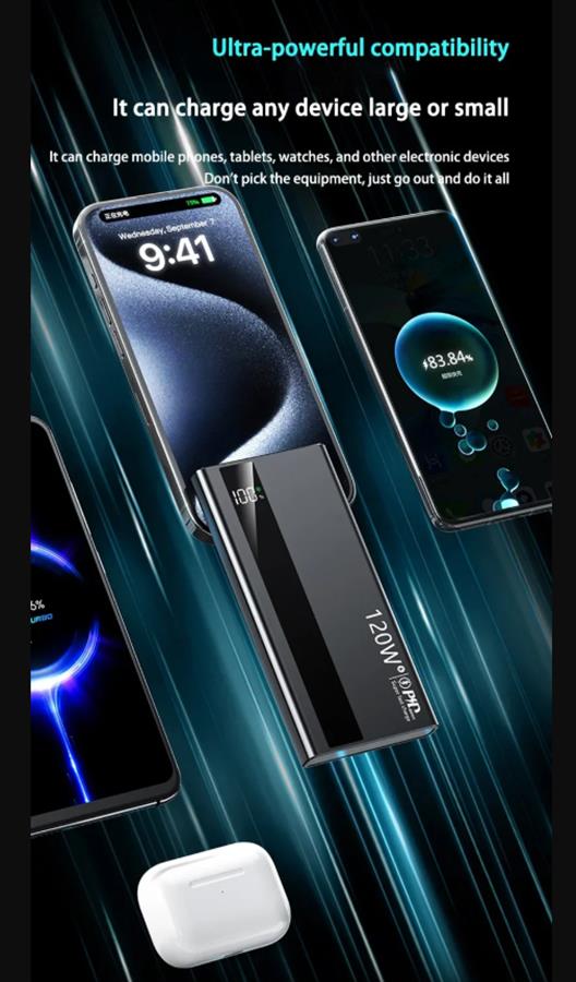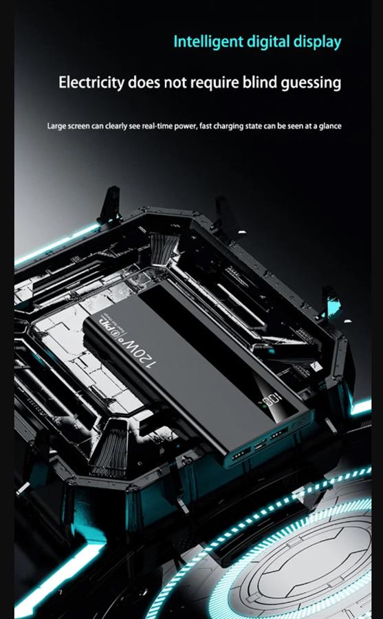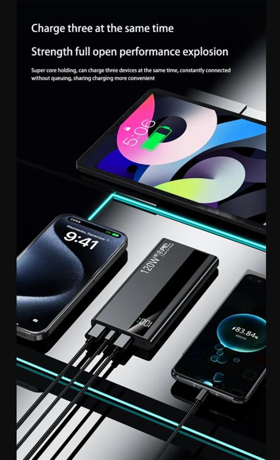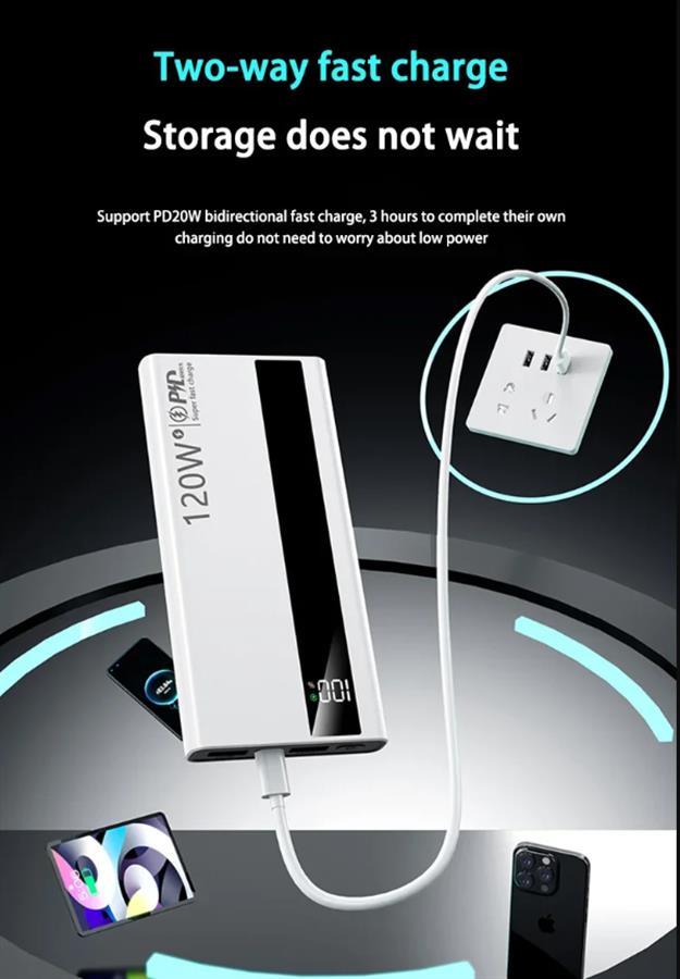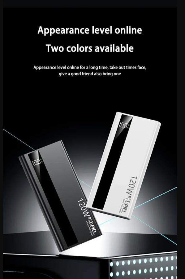 20000mAh მაღალი ტევადობის PowerBank 120W სუპერ სწრაფი დამუხტვის პორტატული გარე ბატარეის PowerBank