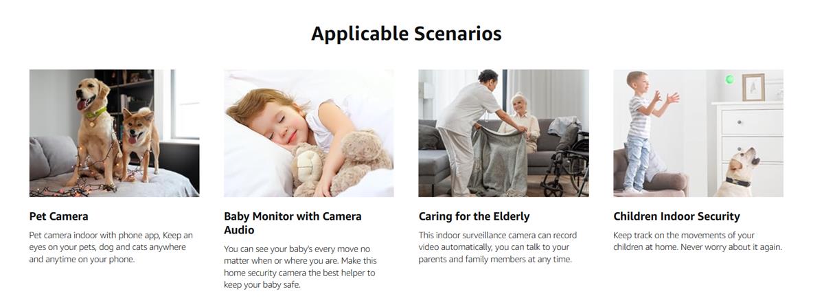 ორმხრივი აუდიო და თავსებადია Alexa-ს შიდა კამერასთან: ჩაშენებული მიკროფონი და დინამიკი საშუალებას იძლევა ორმხრივი კომუნიკაციის აპლიკაციის საშუალებით. თავსებადია Alexa-სთან ხმოვანი შემოწმებისთვის. ესაუბრეთ და მოუსმინეთ ბავშვებს, შინაურ ცხოველებს ან ოჯახის წევრებს დისტანციურად ნებისმიერ დროს - იდეალურია ბავშვის მონიტორებისთვის, შინაური ცხოველების კამერებისთვის ან სახლის უსაფრთხოების კამერებისთვის.