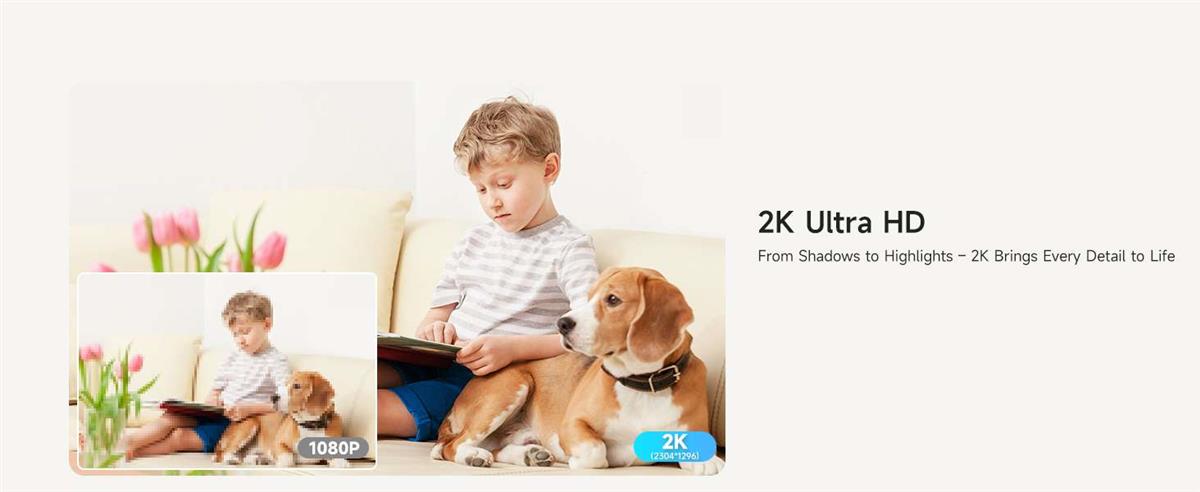 2K Ultra HD ვიდეო, ღამის ხედვა და 8× ციფრული ზუმი: გადაიღეთ მკაფიო 3MP 2K Ultra HD ვიდეო გაუმჯობესებული ინფრაწითელი ღამის ხედვით მკაფიო სურათებისთვის დაბალი განათების ან ბნელ გარემოში. 8× ციფრული ზუმი საშუალებას გაძლევთ ნებისმიერ დროს გადაიღოთ შინაური ცხოველები, ბავშვები ან სახლის ძვირფასი ნივთები ახლოდან. იდეალურია სახლის უსაფრთხოებისთვის, ბავშვის მონიტორინგისთვის ან შინაური ცხოველების კამერის გამოყენებისთვის.