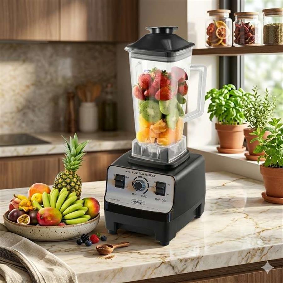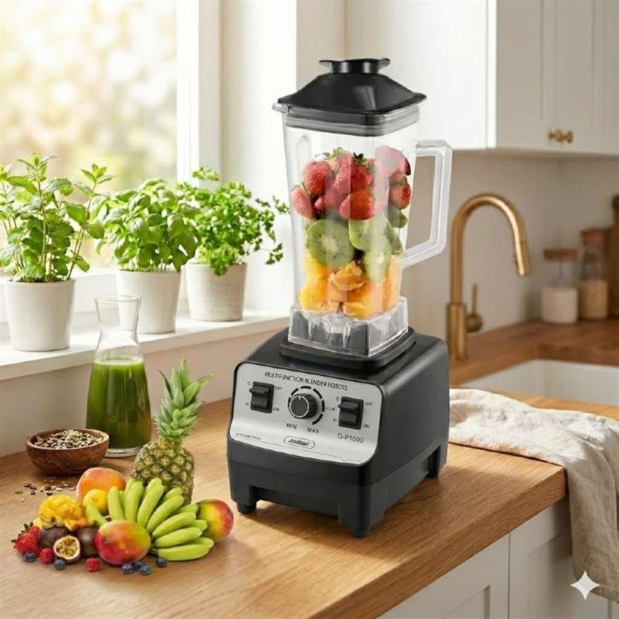 Andowl Q-P1000 მრავალფუნქციური ბლენდერი: 1000W სიმძლავრე, 2 ლიტრიანი მოცულობა და სიჩქარის რეგულირება. იდეალურია სმუზის, სოუსების და მარცვლეულის დასამუშავებლად.