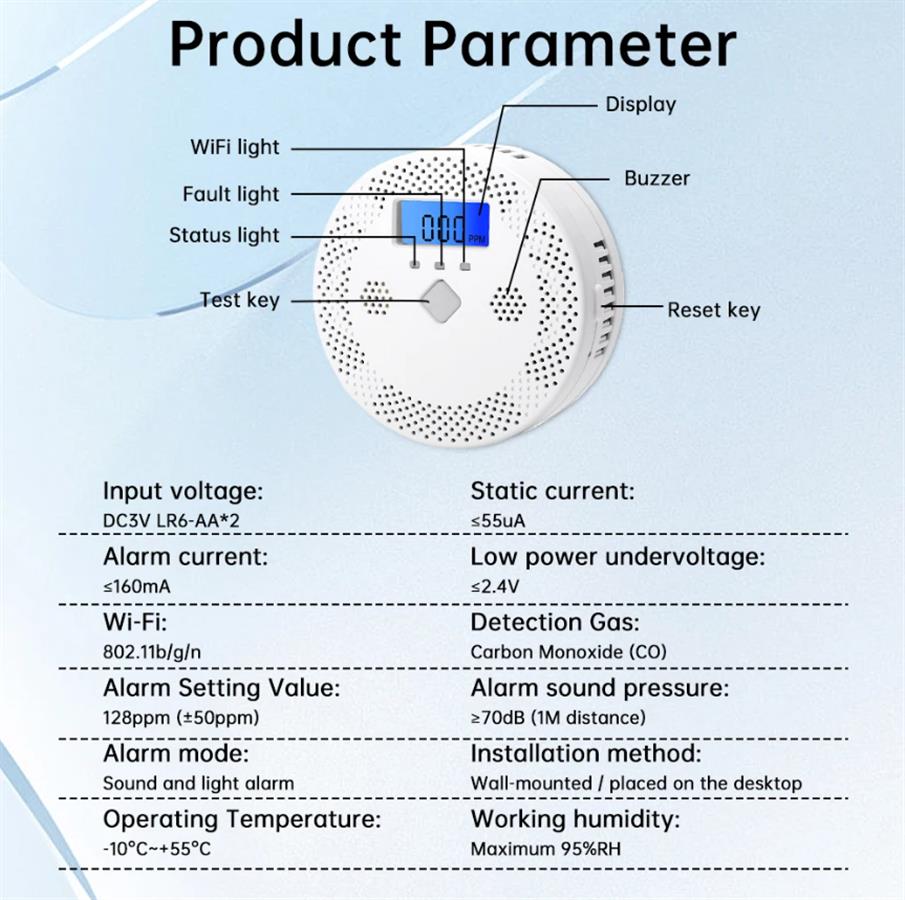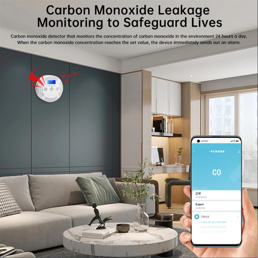 CO WiFi ჭკვიანი ნახშირბადის მონოქსიდის დეტექტორი LCD ციფრული დისპლეით