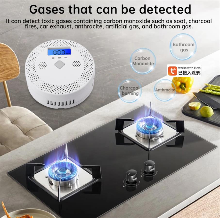 WiFi ჭკვიანი ნახშირბადის მონოქსიდის დეტექტორის სიგნალიზაცია 70dB ხმის გამაფრთხილებელი LCD ციფრული დისპლეით სახლის შიდა CO-ს მოწამვლის სირენა Tuya აპლიკაციისთვის