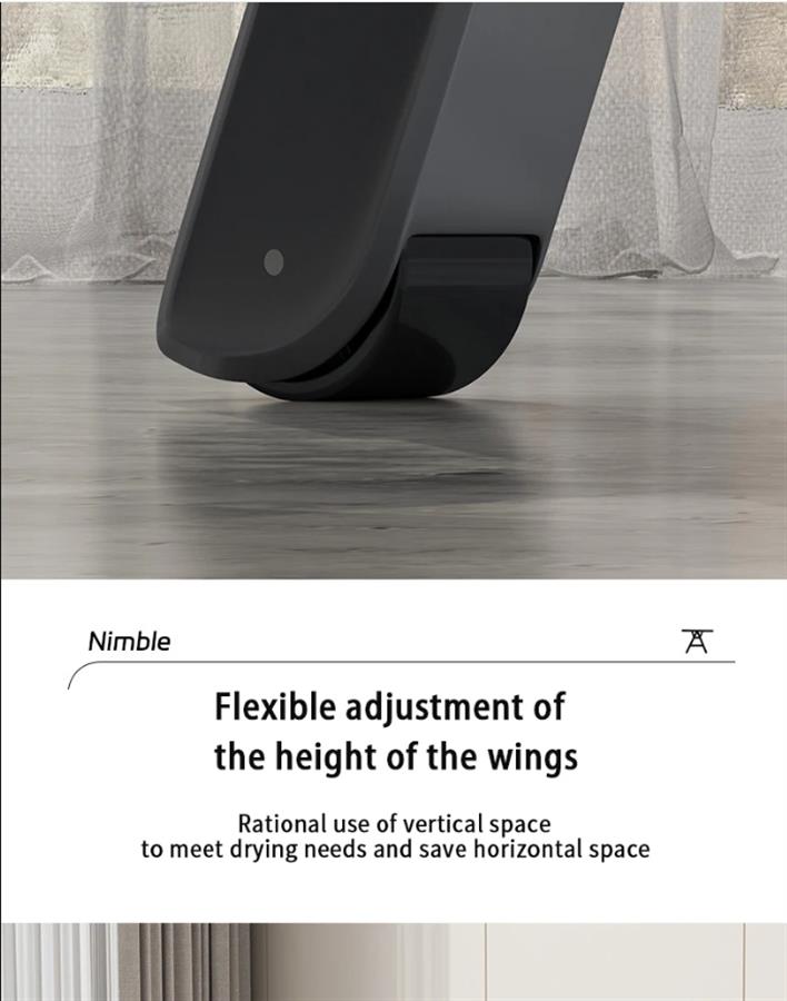 4. სიმაღლის რეგულირება: საშრობი თაროს სიმაღლის თავისუფლად რეგულირება შესაძლებელია საჭიროებისამებრ, რაც უზრუნველყოფს სხვადასხვა სიგრძის ტანსაცმლის იდეალურად ჩამოკიდებას, ეფექტურად თავიდან აიცილებს ტანსაცმლის მიწასთან შეხებას და ინარჩუნებს მათ სისუფთავეს.