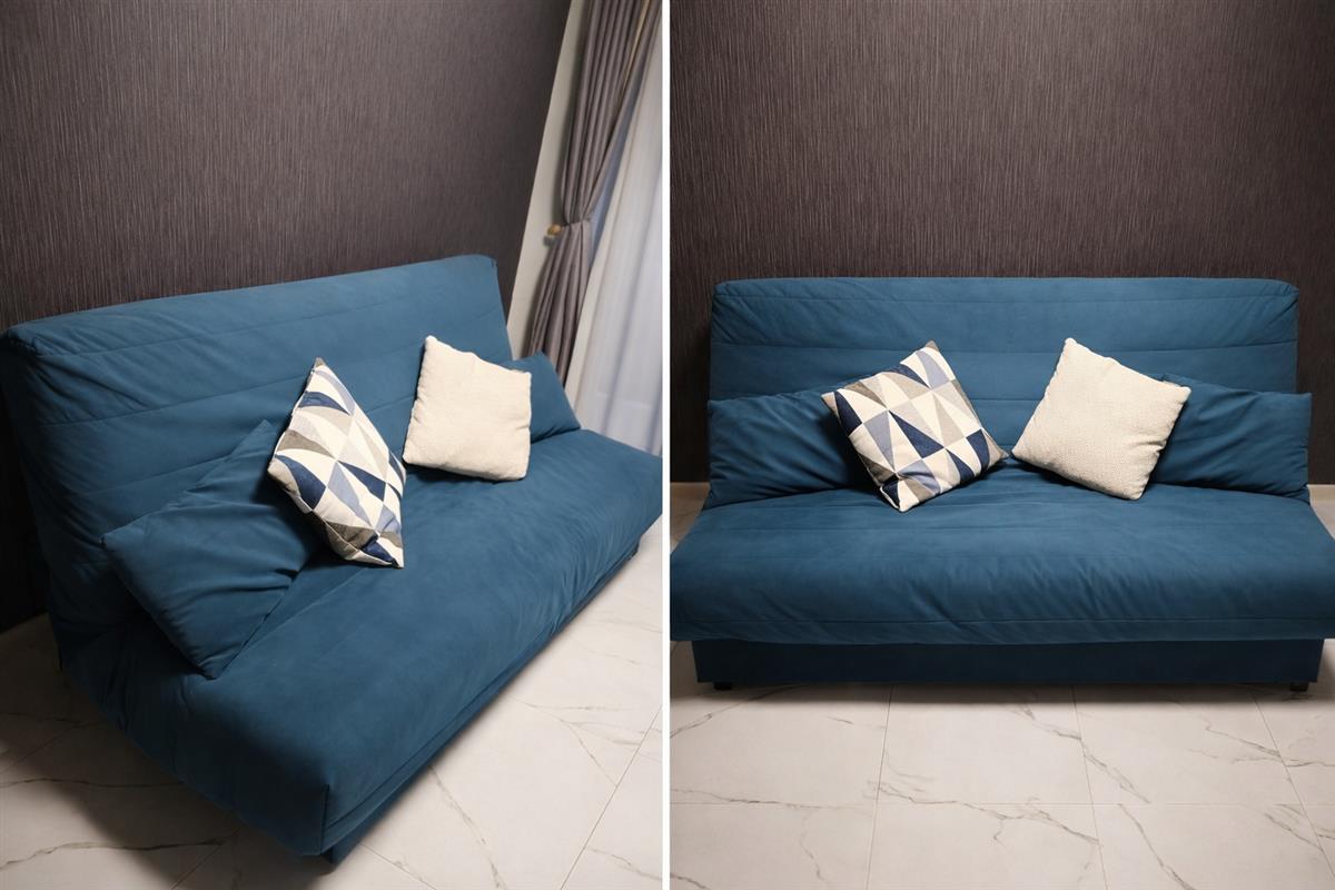 მოყვება დეკორატიული ბალიშები, როგორც სურათზეა ნაჩვენები. არის ფართო სათავსო ნივთებისთვის (თეთრეული, საბნები და ა.შ.). გადასაფარებელი მოსახსნელია მარტივი გაწმენდისა და მოვლისთვის.