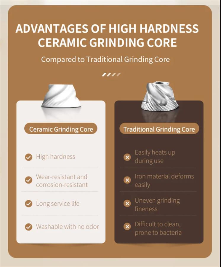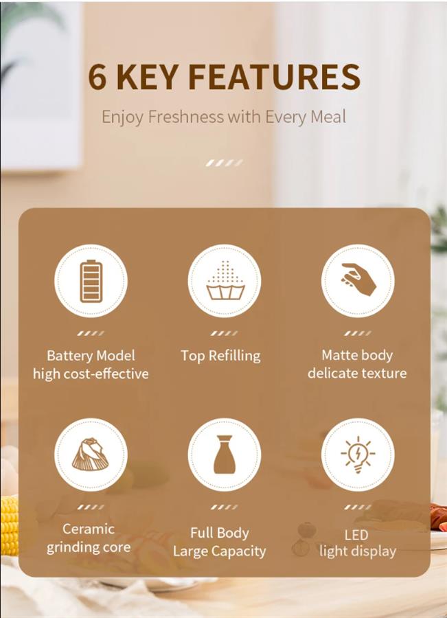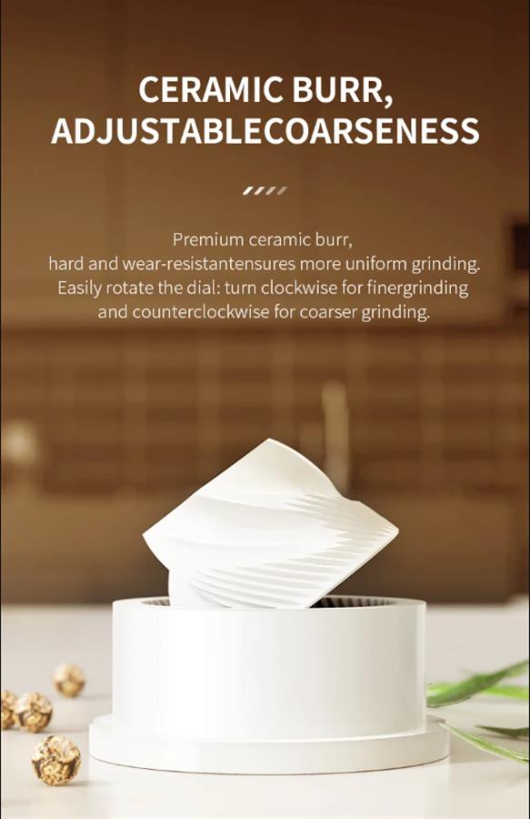 სანდო მასალა: ჩვენი ავტომატური დატენვადი საფქვავი დამზადებულია ABS პლასტმასისგან მსუბუქი და ურღვევი ექსტერიერისთვის, ხოლო კორპუსი გლუვი მქრქალი შავი ფერისაა, რომელიც ნებისმიერ სამზარეულოს უხდება. საფქვავის შიდა ბირთვი კერამიკულია გლუვი დაფქვისა და გამძლეობისთვის, ასევე კარგად მუშაობს სანელებლების დასაფქვავად.