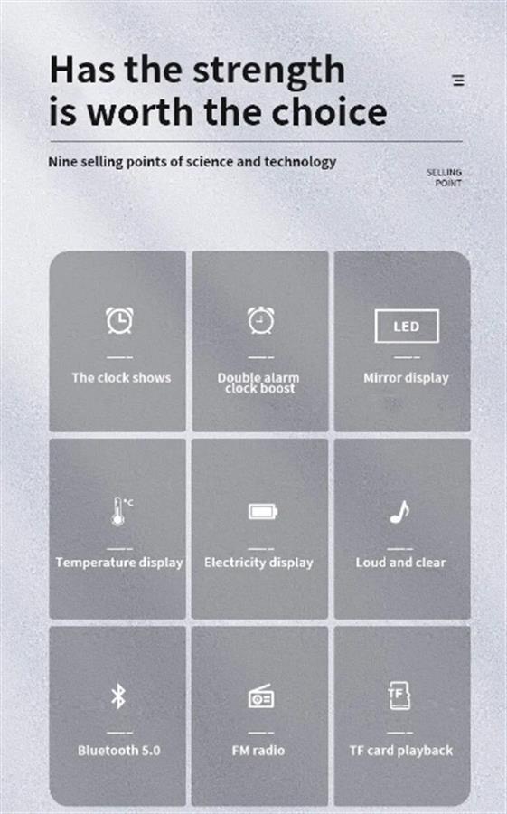 • FM Mini Card Mirror მაღვიძარა: დინამიკი მოქმედებს როგორც მაღვიძარა, FM მინი ბარათის სარკე, რომელიც შეიძლება გამოყენებულ იქნას როგორც სარეზერვო საშუალება.