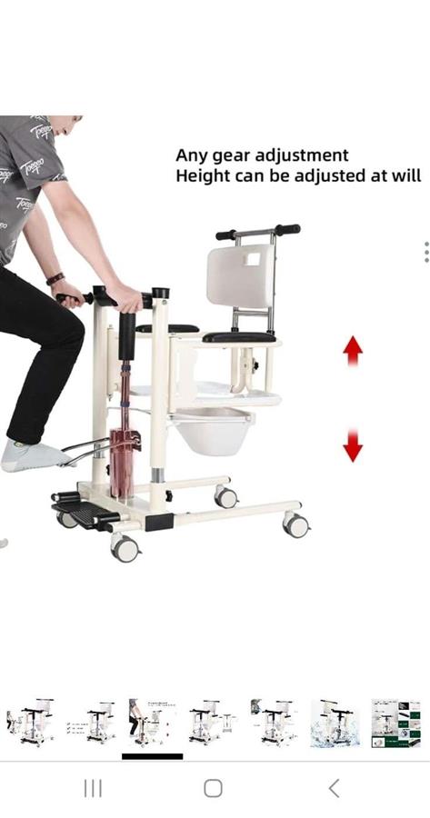 ჰიდრავლიკური სკამი გამოიყენება სახლის პირობებში. ჰიდრავლიკური პედალის საშუალებით რეგულირდება სიმაღლე და სკამი იხსნება 180 გრადუსით, რაც სასუალებას იძლევა ავიყვანოთ პაციენტი ნებისმიერი ადგილიდან. შესაძლებელია ასევე სააბაზანოში გამოყენება. სკამი არის 45სმ სიგანის. დასაჯდომის სიმაღლე რეგულირდება 75სმ-დან 100სმ- მდე. აქვს თავსახურიანი ვედრო-ქოთანი და სკამზე დასადები ბალიში. გათვლილია 120 კგ - ზე.