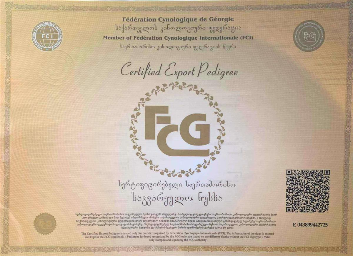 ✅ საგვარეულო: მამა FCI FCG-ის წევრია, რაც ლეკვების მაღალ ხარისხს ადასტურებს.