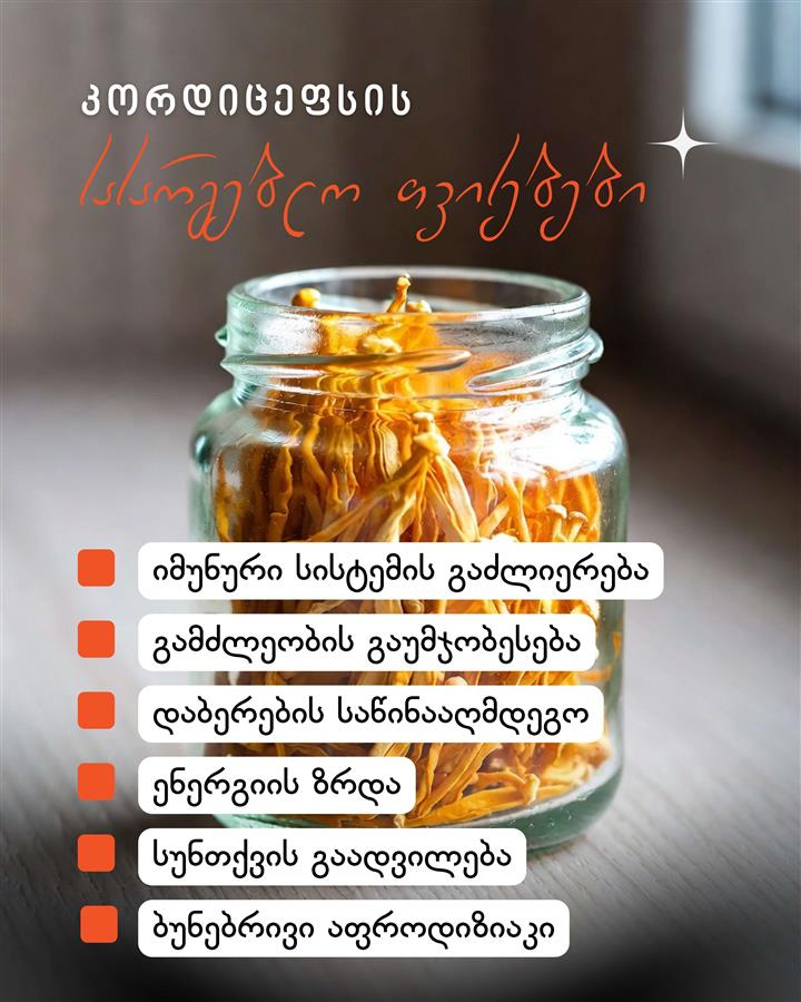კორდიცეფსი არის ბუნებრივი ანტიბიოტიკი. მას აქვს ანთების საწინააღმდეგო და ტკივილგამაყუჩებელი მოქმედება, აუმჯობესებს სისხლის მიმოქცევას, აუმჯობესებს იმუნიტეტს. გამოიყენება ინფექციური დაავადებების, სასუნთქი გზების, ღვიძლის დაავადებების სამკურნალოდ და კიბოს პროფილაქტიკისთვის. ეხმარება გულის და სისხლძარღვების დაავადებებს. ხელს უწყობს ორგანიზმიდან ტოქსინების გამოდევნას.