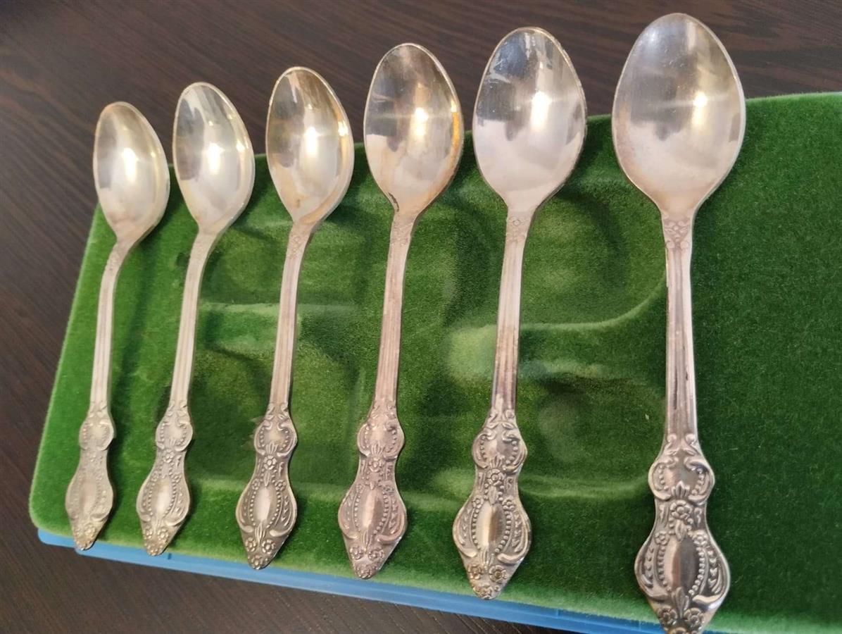 იყიდება ვინტაჟური ჩაის კოვზების კომპლექტი (6 ცალი) ორიგინალ ჩასადებში. დამზადებულია სსრკ-ში, რეჟევსკის მექანიკურ ქარხანაში. მასალა — მელქიორი (MNC) ვერცხლის საფარით. კოვზები გაფორმებულია კლასიკური რელიეფური ორნამენტით "ურალის ვარდი". იდეალურია კოლექციონერებისთვის ან სუფრის დახვეწილი სერვირებისთვის. მდგომარეობა: კარგი, ბუნებრივი პატინით.