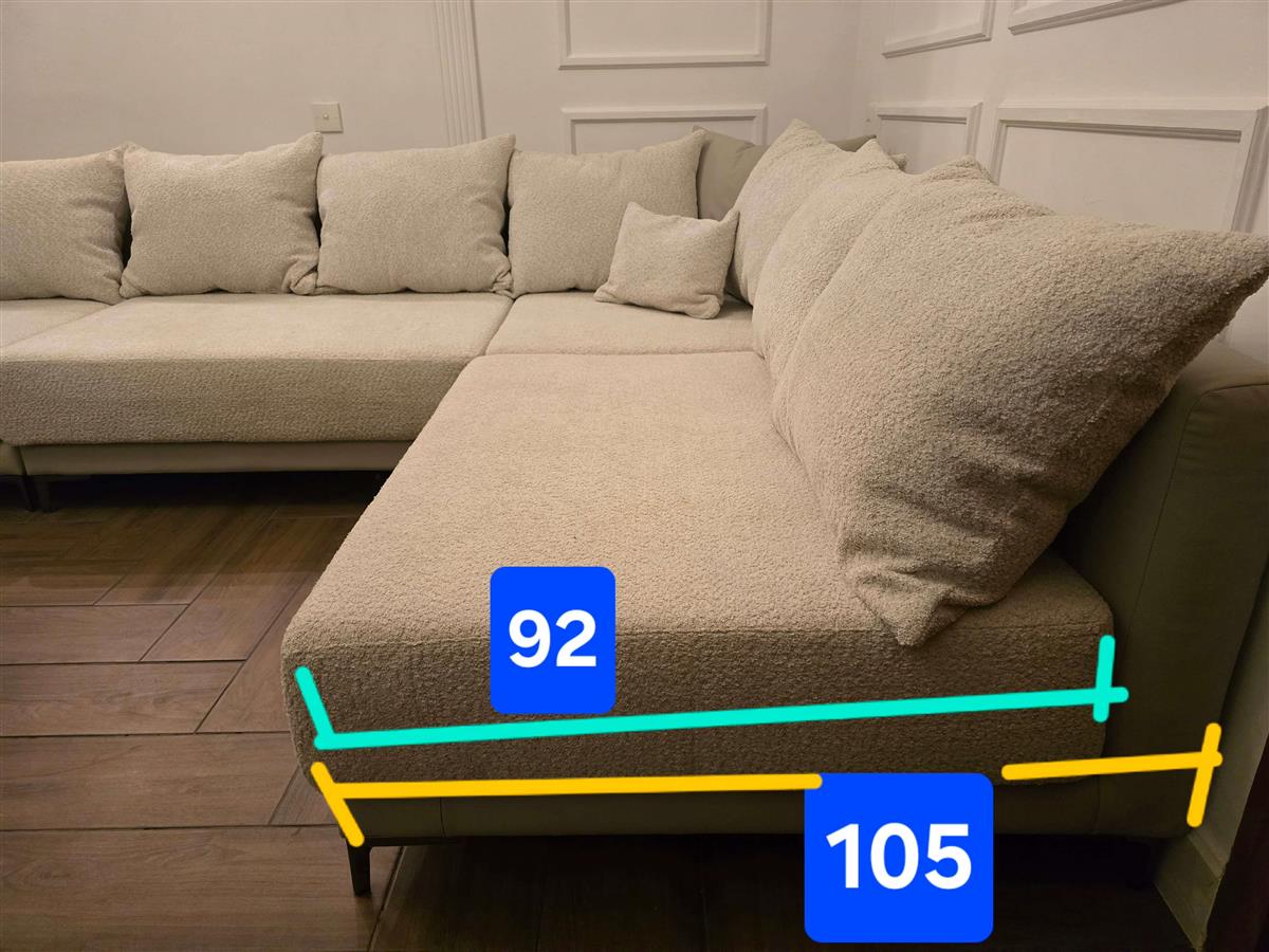ოთხი სექციისგან შემდგარი, ახალი, კომფორტული, ორთოპედიული კუთხის დივანი. ტყავი / ბუკლე სიგრძე 340 სმ სიგანი 220 სმ სიღრმე 92 სმ სიმაღლე 69 სმ Show original