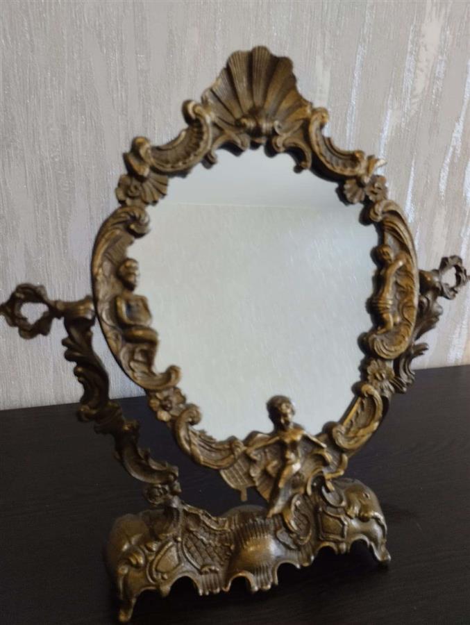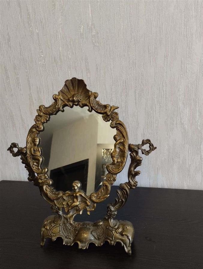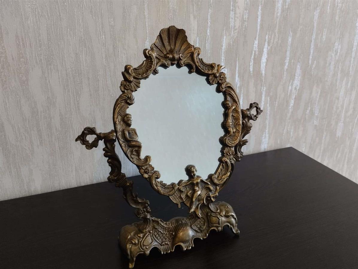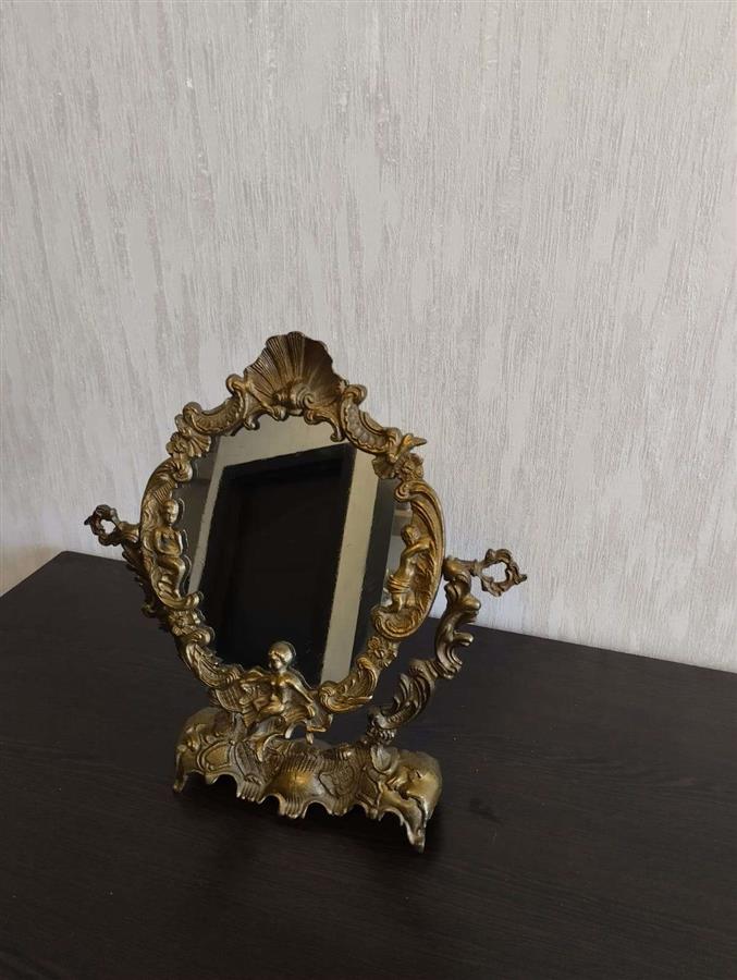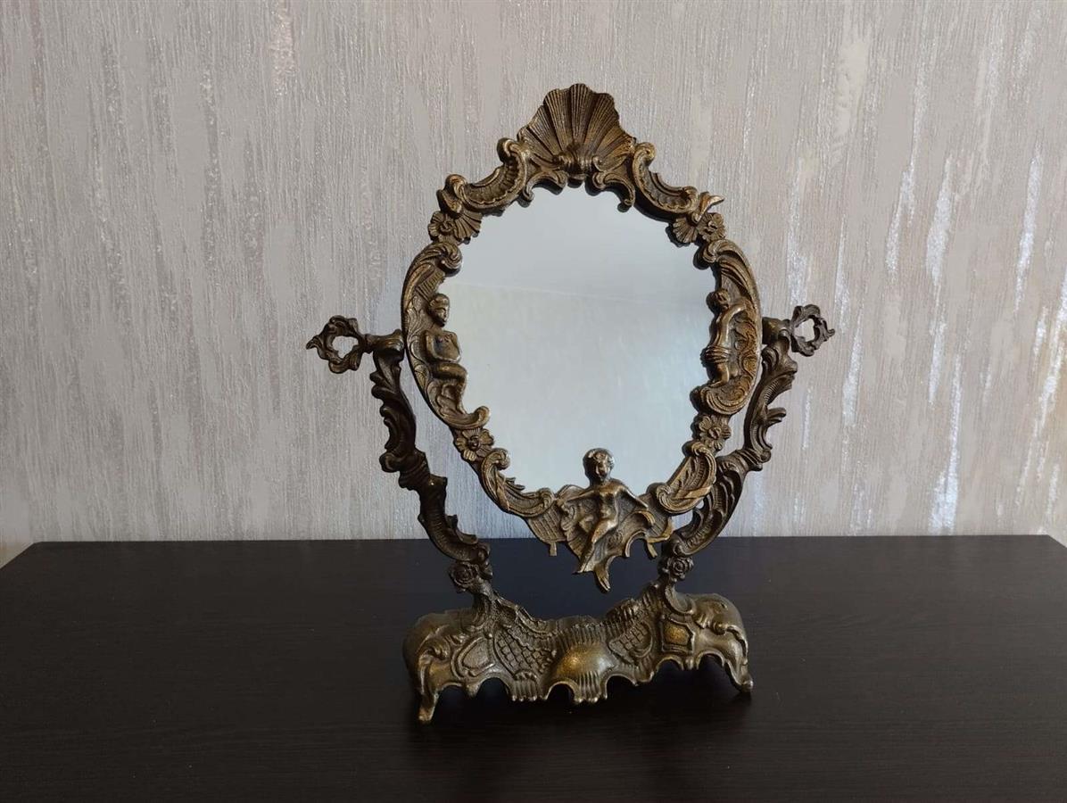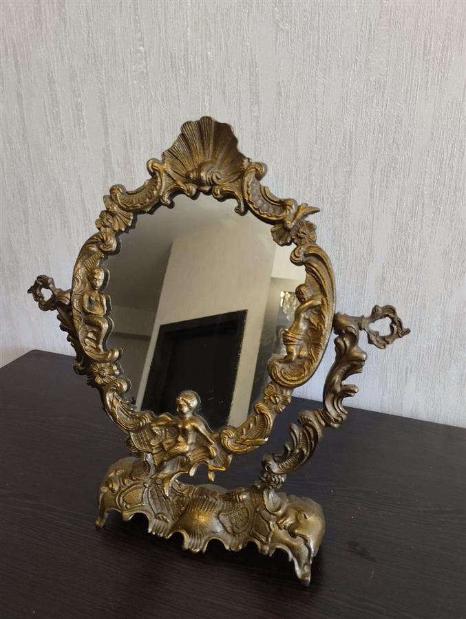 იყიდება მდიდრული ვინტაჟური მაგიდის სარკე მოძრავი (პსიშე) მექანიზმით. ჩარჩო დამზადებულია მძიმე ლითონისგან (სავარაუდოდ ბრინჯაო ან შპიატი) და გაფორმებულია დახვეწილი ფიგურული ორნამენტებით, ანგელოზებითა და ნიჟარის გამოსახულებით. იდეალურია თავმოყვარეობის მაგიდისთვის ან როგორც ინტერიერის გამორჩეული დეკორი.