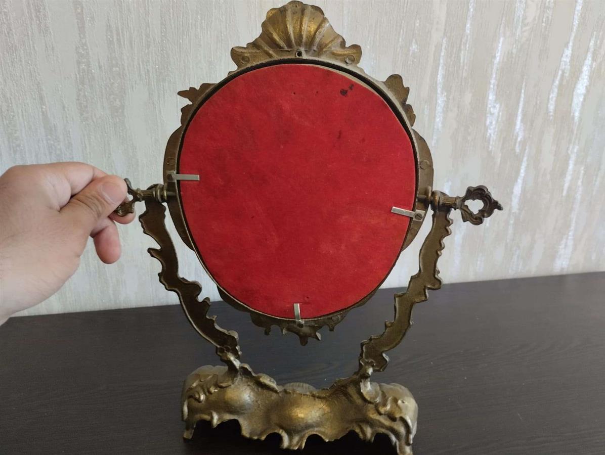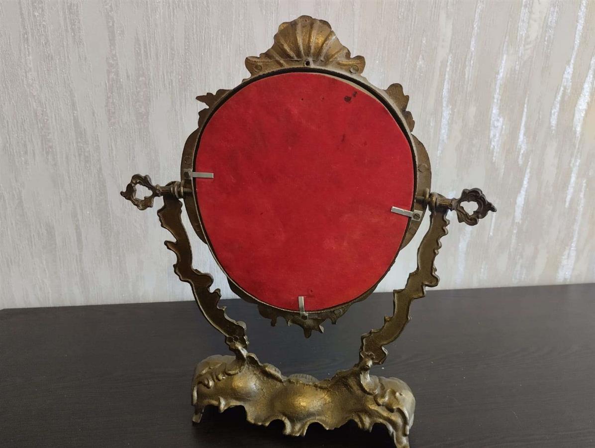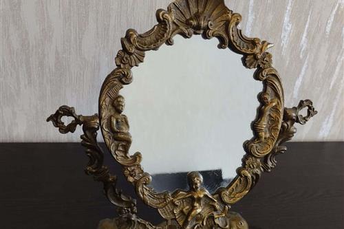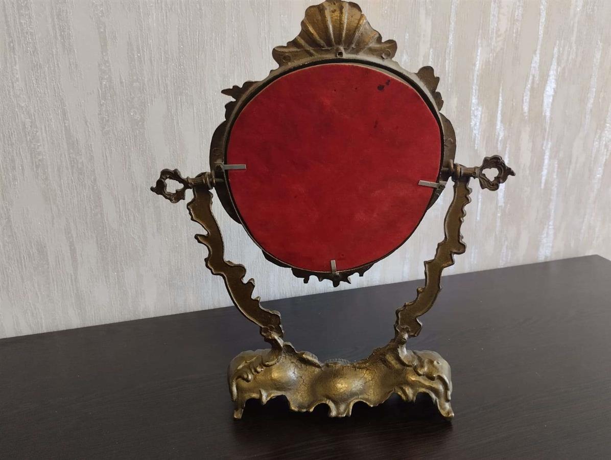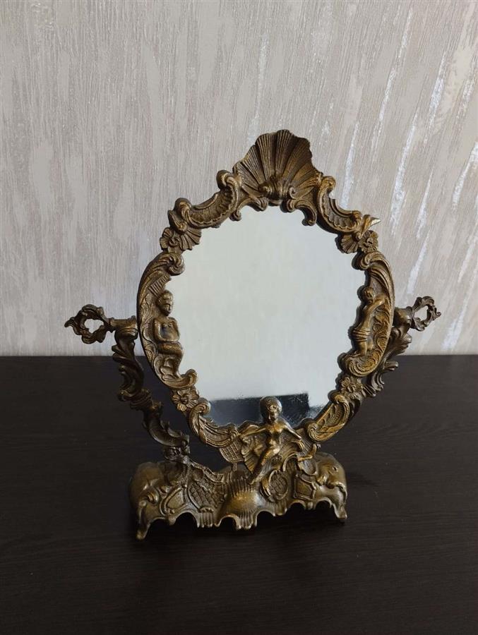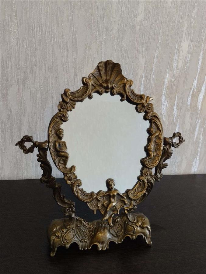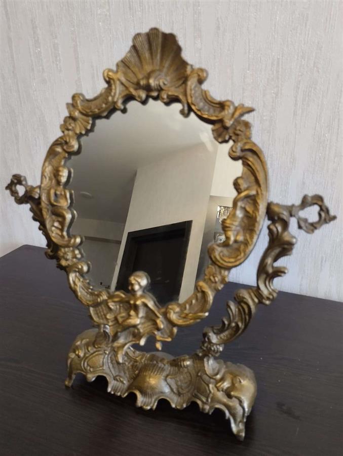 იყიდება მდიდრული ვინტაჟური მაგიდის სარკე მოძრავი (პსიშე) მექანიზმით. ჩარჩო დამზადებულია მძიმე ლითონისგან (სავარაუდოდ ბრინჯაო ან შპიატი) და გაფორმებულია დახვეწილი ფიგურული ორნამენტებით, ანგელოზებითა და ნიჟარის გამოსახულებით. იდეალურია თავმოყვარეობის მაგიდისთვის ან როგორც ინტერიერის გამორჩეული დეკორი.