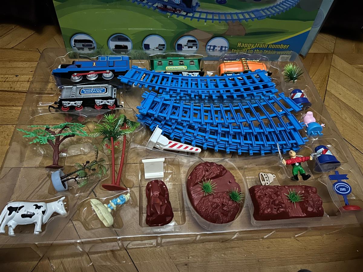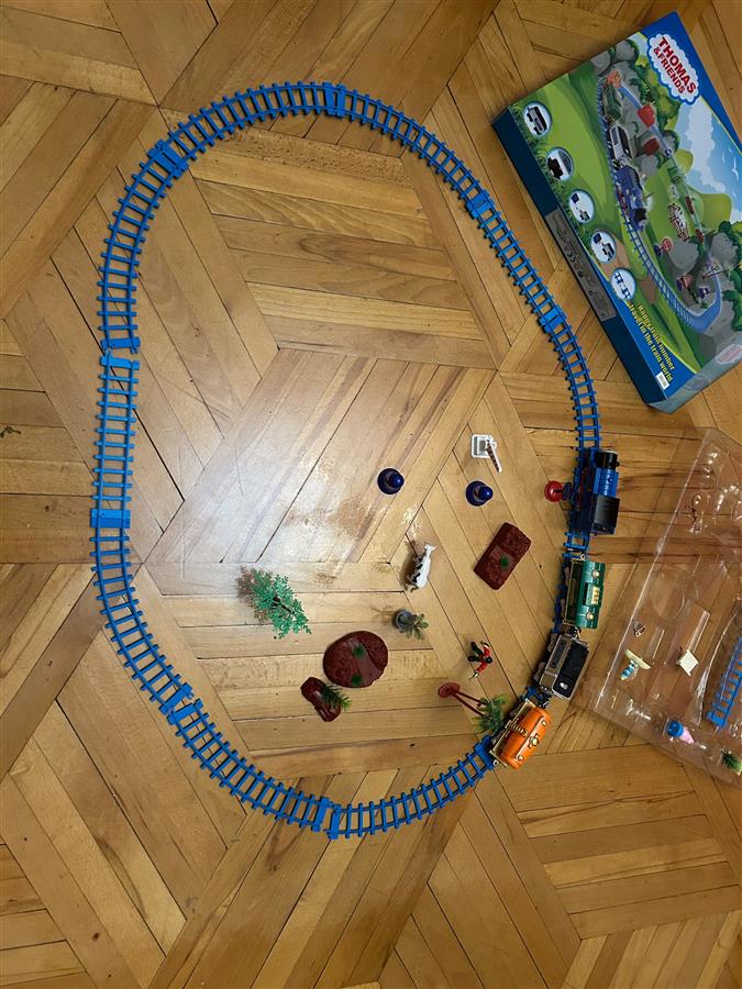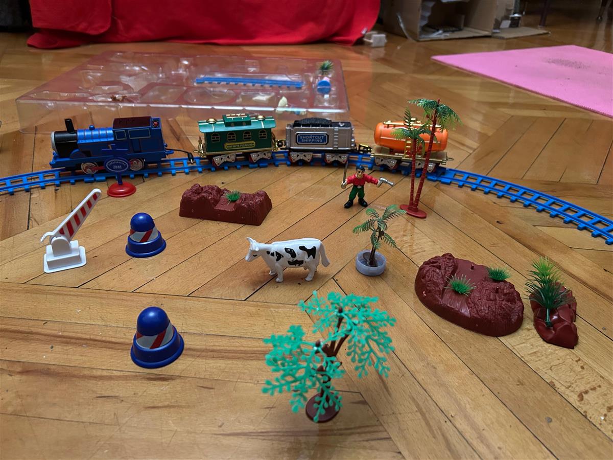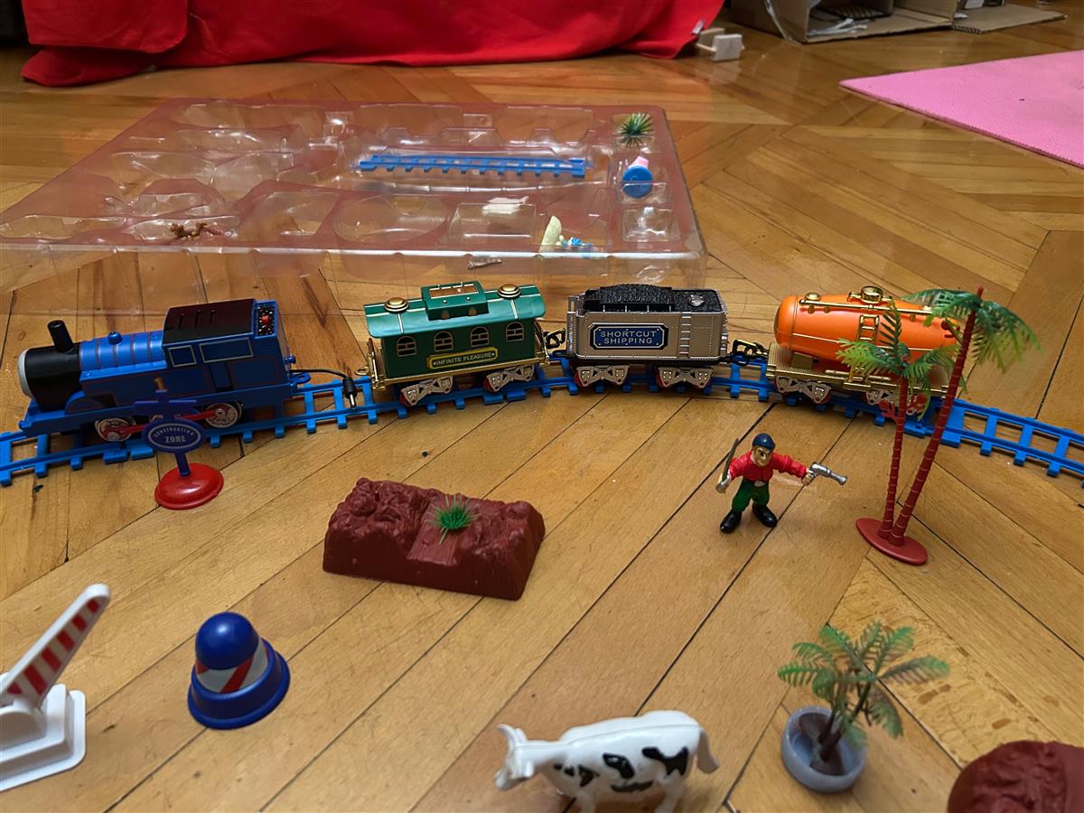 ან მაგიდაზე ან იატაკზე ლიანდაგები და მატარებელი, მუშაობს ბატარეიჯებზე Show original