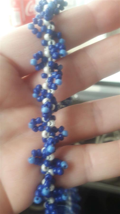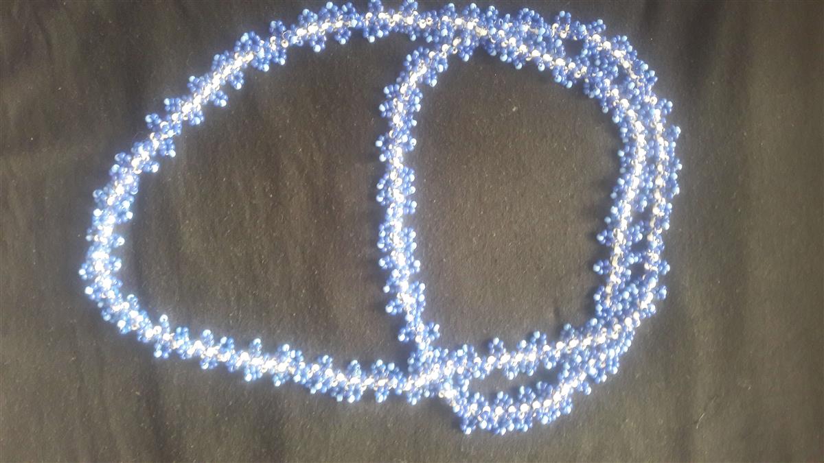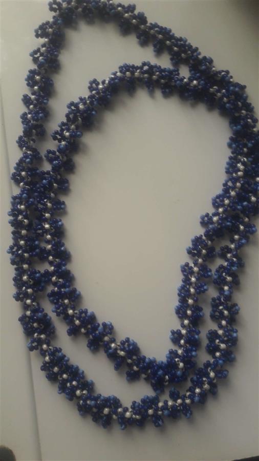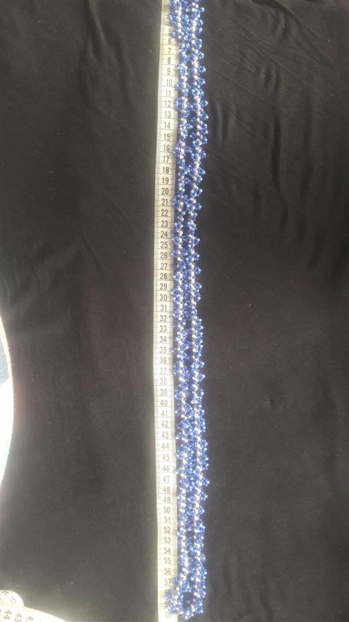მძივი გრეხილი დამზადებულია სხვადასხვა ზომის ბისერის თვლებით, ჯინსის ფერებში: თეთრი, მუქი ლურჯი გადადის იისფერში და ღია ლურჯი. ჩამკეტის გარეშე, თავზე ჩამოსაცმელი 120 სმ. (+- 2სმ.). ექსკლუზიური, ხელნაკეთი ნამუშევარი. შემიძლია მსგავსი სამკაულის შეკვეთით დამზადება ფერების არჩევით სამოსთან შეხამებისთვის და ნატურალური ქვების ჩართვით, ზომის შეთანხმებით, ჩამკეტის გაკეთებით. ფასი დაკორექტირდება მასალის გამოყენების შესაბამისად. Show original