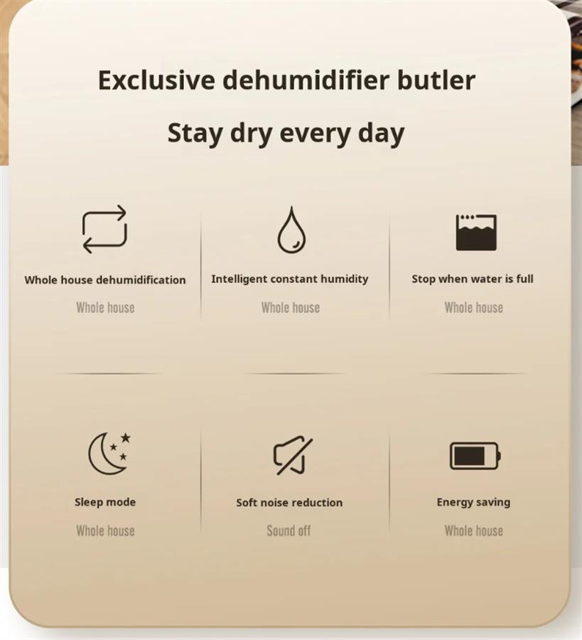 *ავტომატური გამორთვა: ინტელექტუალური წყლის სრული გაჩერების ფუნქციით აღჭურვილი, ჰაერის გამშრობი ავტომატურად ითიშება, როდესაც წყლის ავზი სავსეა, იცავს გადმოდინებისგან და გარანტიას იძლევა უსაფრთხო მუშაობისთვის.