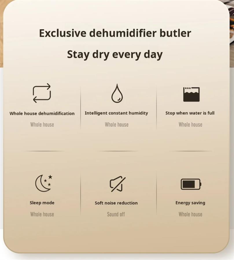 საყოფაცხოვრებო ჰაერის გამშრობი, საშრობი, ტენიანობისგან დაცული 2.8 ლიტრიანი წყლის ავზი, წყლის სრული გაჩერებით, შიდა ჰაერის გამწმენდი, სარდაფის ჰაერის გამშრობი