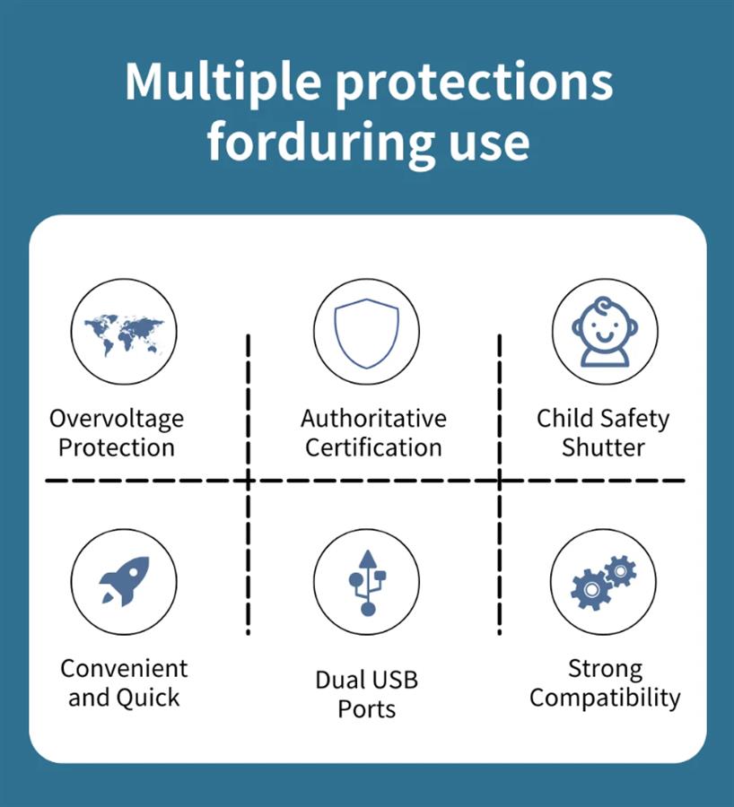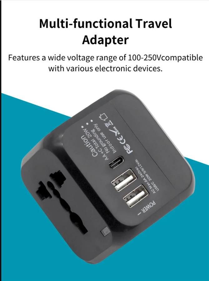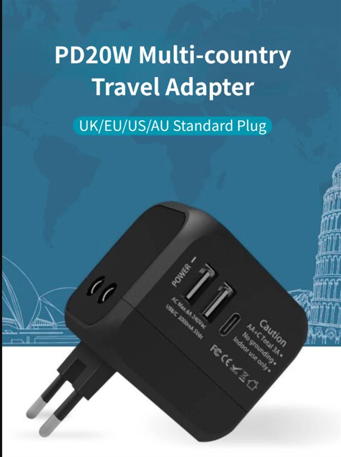 PD20W უნივერსალური სწრაფი დამუხტვის სამოგზაურო ადაპტერი 2 USB პორტით, Type-C მრავალფუნქციური ევროპისთვის, აშშ სინგაპური, ავსტრალია