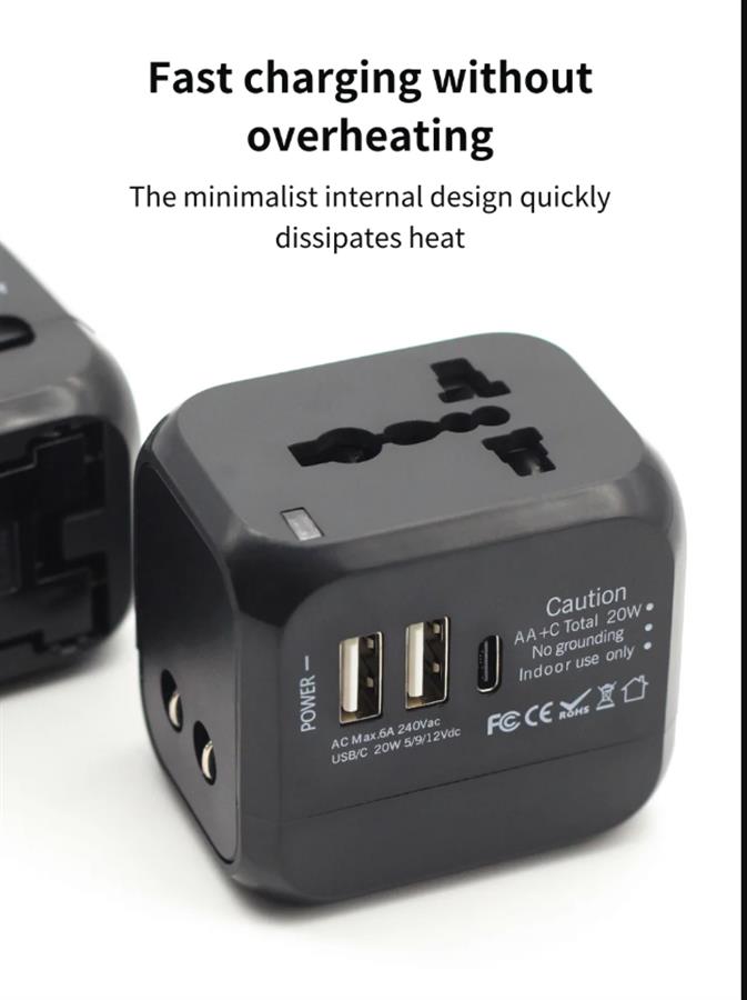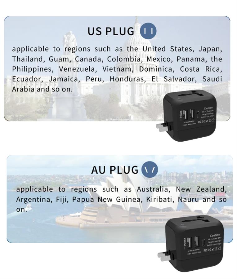 PD20W უნივერსალური სწრაფი დამუხტვის სამოგზაურო ადაპტერი 2 USB პორტით, Type-C მრავალფუნქციური ევროპისთვის, აშშ სინგაპური, ავსტრალია, სოკეტი