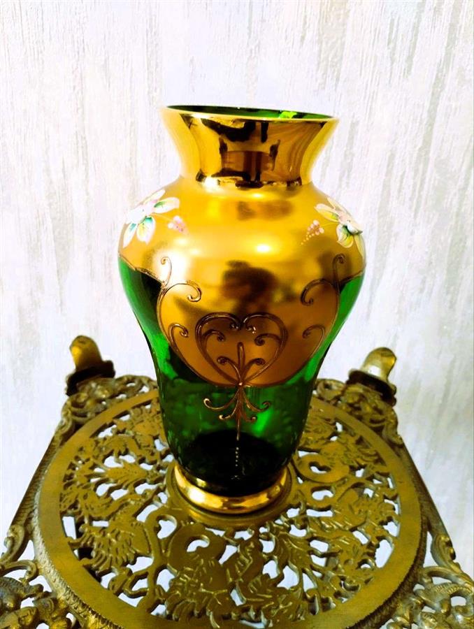 ბოჰემური ვაზა სპილენძის სადგამზე (მწვანე ჩამოსხმა)