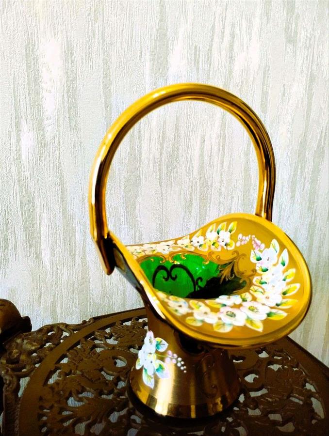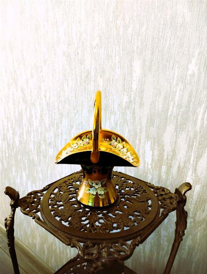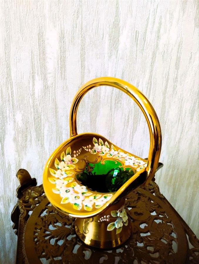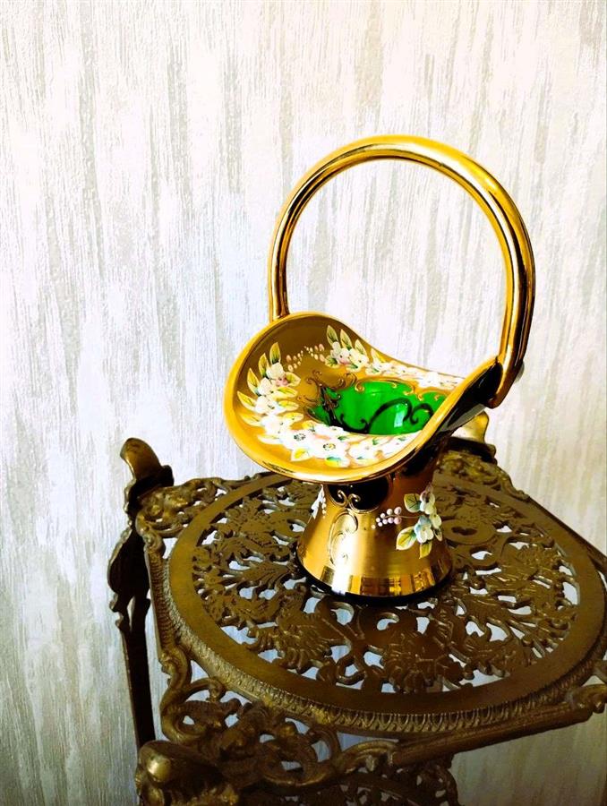 ეს კოლექციური ვინტაჟური ტკბილეულის კალათა დამზადებულია ცნობილი მწვანე ბოჰემური მინისგან (ჩეხეთი) მაღალი მინანქრის ტექნიკის გამოყენებით. მისი იშვიათი ფორმა მაღალი სახელურით მას განსაკუთრებით ძვირფასს ხდის კოლექციონერებისთვის. ბოჰემური ვაზა სპილენძის სადგამზე (მწვანე ჩამოსხმა)