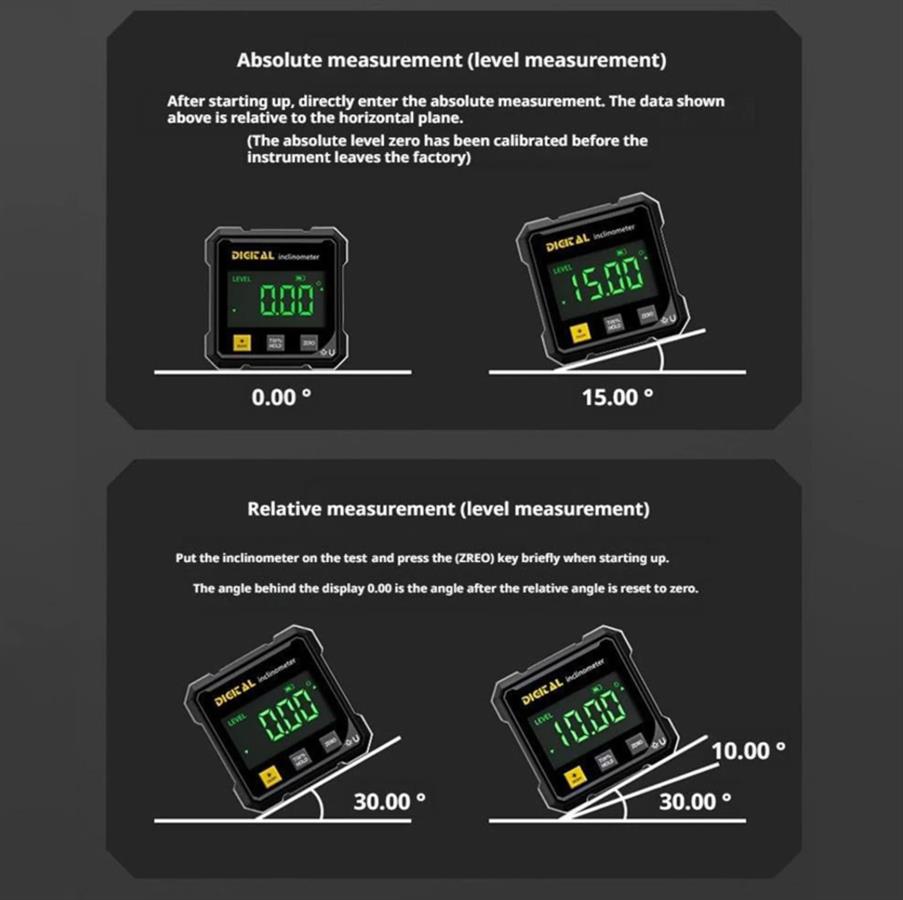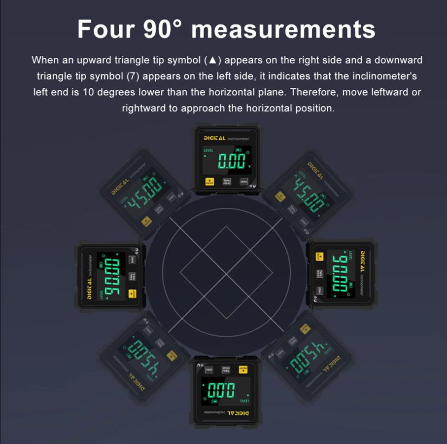 1. მაღალი სიზუსტის გაზომვა: ეს ციფრული კუთხის საზომი უზრუნველყოფს ულტრა ზუსტ მაჩვენებლებს 4x90° სრული დაფარვით, რაც საშუალებას გაძლევთ მარტივად გაზომოთ როგორც აბსოლუტური, ასევე ფარდობითი კუთხეები ან დახრილობა ნებისმიერ სიტუაციაში.