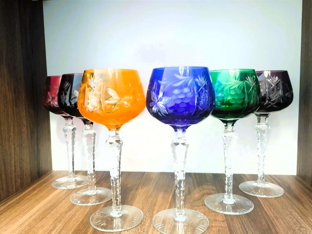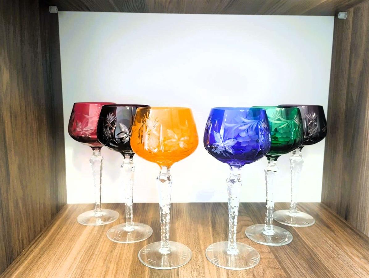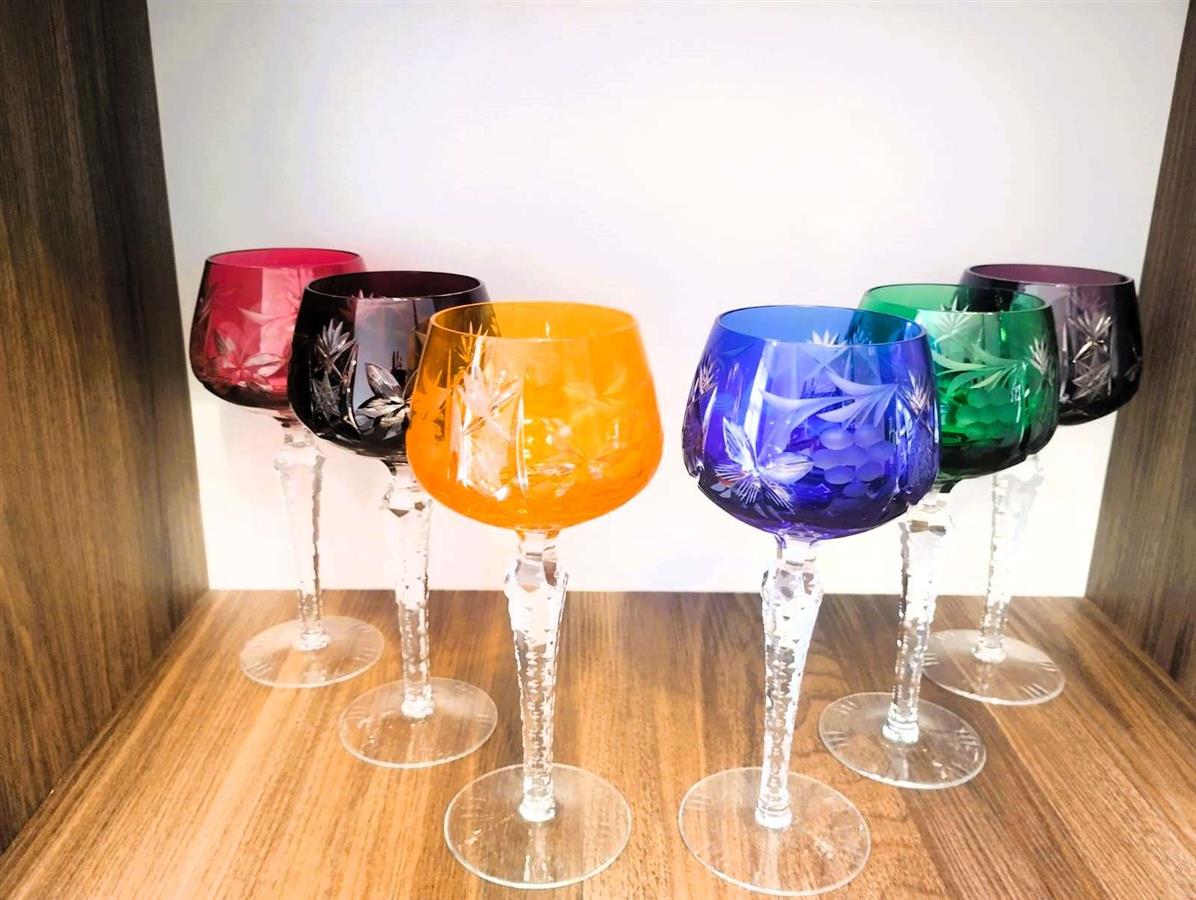ფოტოზე გამოსახულია ცნობილი გერმანული მწარმოებლის, Lausitzer Glas-ის (აღმოსავლეთ გერმანია) ფერადი ბროლისგან დამზადებული ვინტაჟური ღვინის ჭიქები, რომლებიც დამზადებულია „ხელით ჭრის“ (Handgeschliffen) ტექნიკით. ამ სტილის ჭიქას ხშირად „Römer“-ს უწოდებენ. კოლექციონერები მათ აფასებენ ტყვიის ოქსიდის მაღალი შემცველობის (24% PbO) გამო, რაც უზრუნველყოფს განსაკუთრებულ სიცხადეს, „ბრილიანტის“ ბზინვარებას და გამჭვირვალე რგოლს. იყიდება: 6 ღვინის ჭიქის მდიდრული კოლექციური ნაკრები. ვინტაჟური, 1960-1980-იანი წლები, წარმოებული ლეგენდარული Lausitzer Glas-ის (აღმოსავლეთ გერმანია) მიერ.