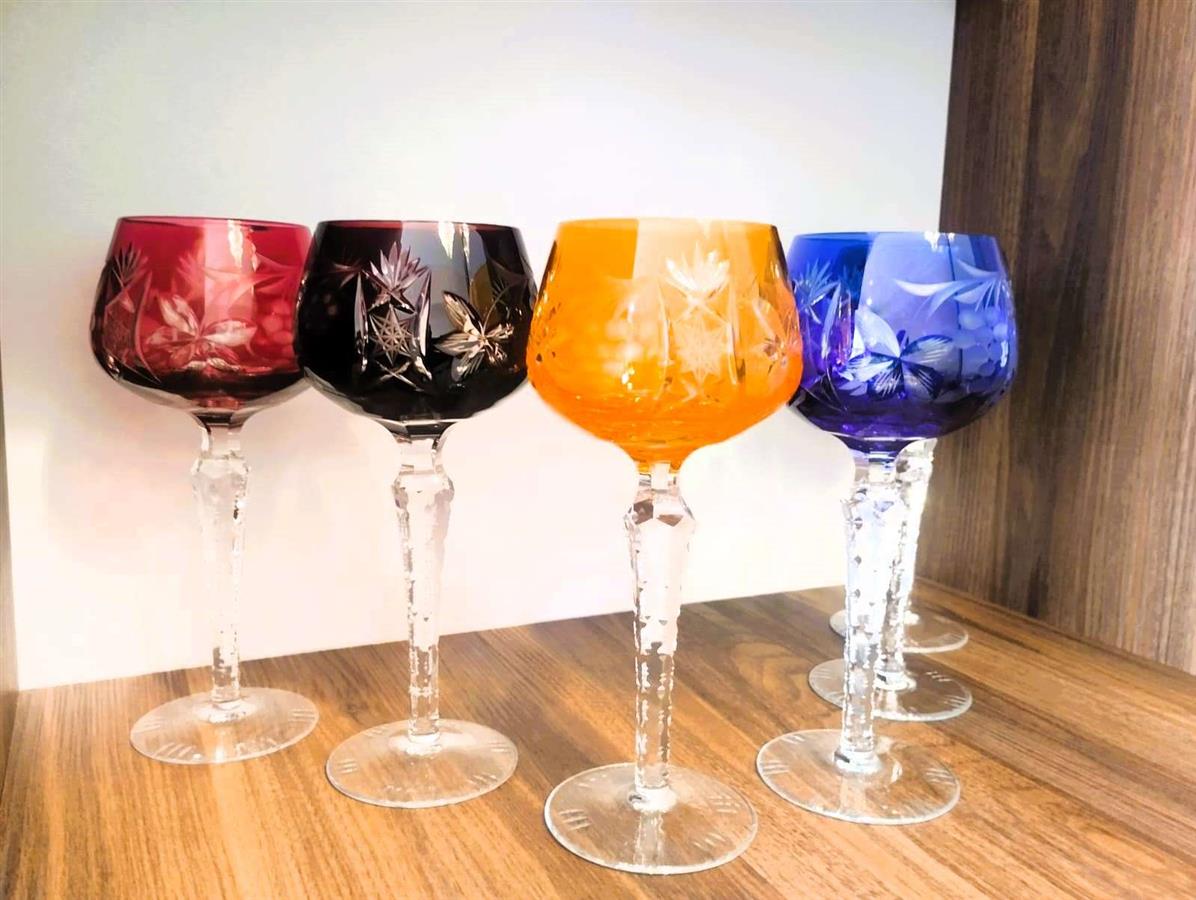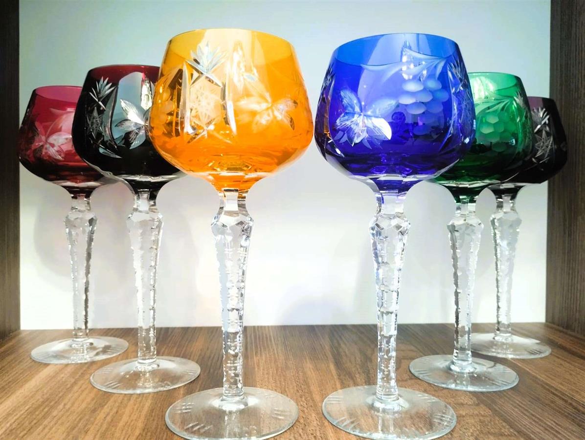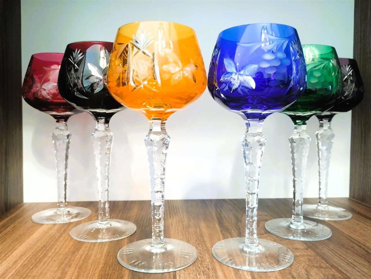 ფოტოზე გამოსახულია ცნობილი გერმანული მწარმოებლის, Lausitzer Glas-ის (აღმოსავლეთ გერმანია) ფერადი ბროლისგან დამზადებული ვინტაჟური ღვინის ჭიქები, რომლებიც დამზადებულია „ხელით ჭრის“ (Handgeschliffen) ტექნიკით. ამ სტილის ჭიქას ხშირად „Römer“-ს უწოდებენ. კოლექციონერები მათ აფასებენ ტყვიის ოქსიდის მაღალი შემცველობის (24% PbO) გამო, რაც უზრუნველყოფს განსაკუთრებულ სიცხადეს, „ბრილიანტის“ ბზინვარებას და გამჭვირვალე რგოლს. იყიდება: 6 ღვინის ჭიქის მდიდრული კოლექციური ნაკრები. ვინტაჟური, 1960-1980-იანი წლები, წარმოებული ლეგენდარული Lausitzer Glas-ის (აღმოსავლეთ გერმანია) მიერ.