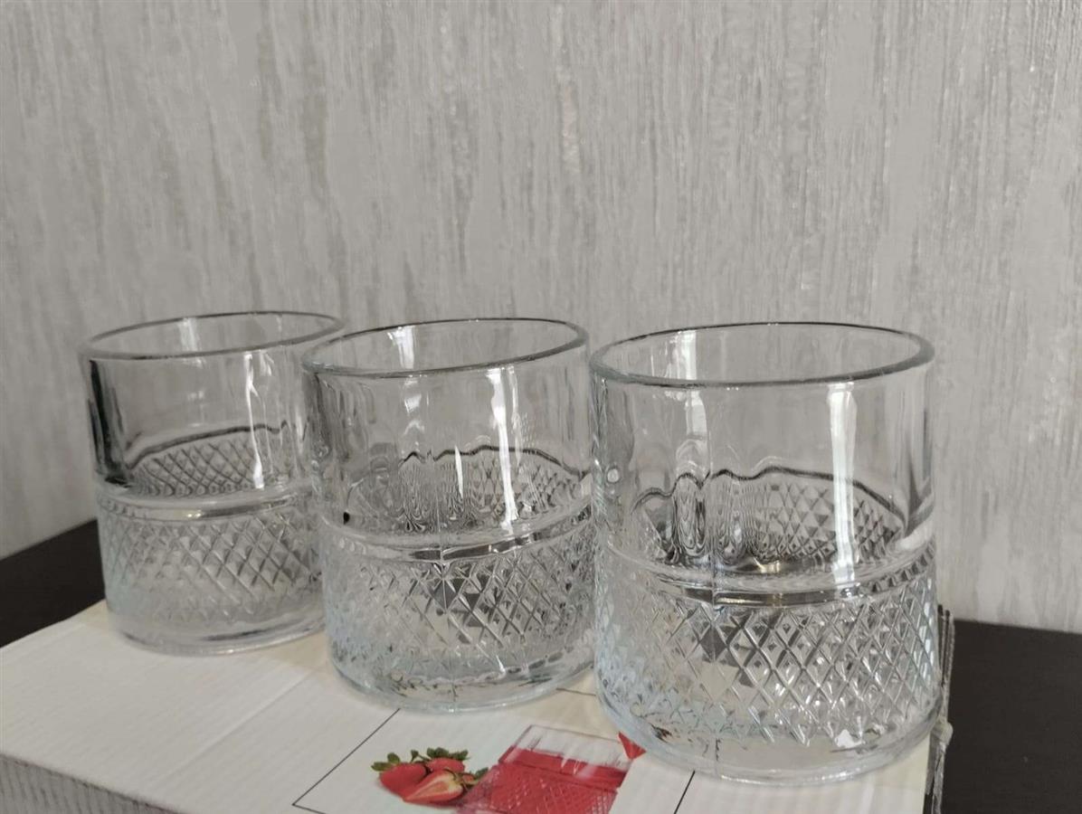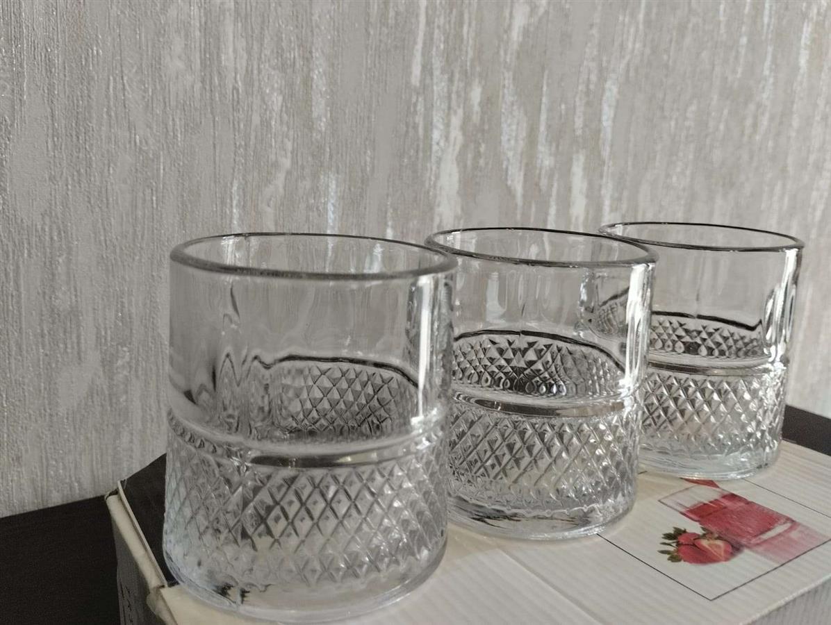 იყიდება მაღალი ხარისხის შუშის ჭიქების ნაკრები ორიგინალ შეფუთვაში. ჭიქები გამოირჩევა კლასიკური "ალმასის" დაწახნაგების დიზაინით. იდეალურია ვისკის, წვენებისა და სხვა ცივი სასმელებისთვის. მასალა არის გამძლე და გამჭვირვალე მინა.
