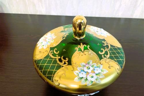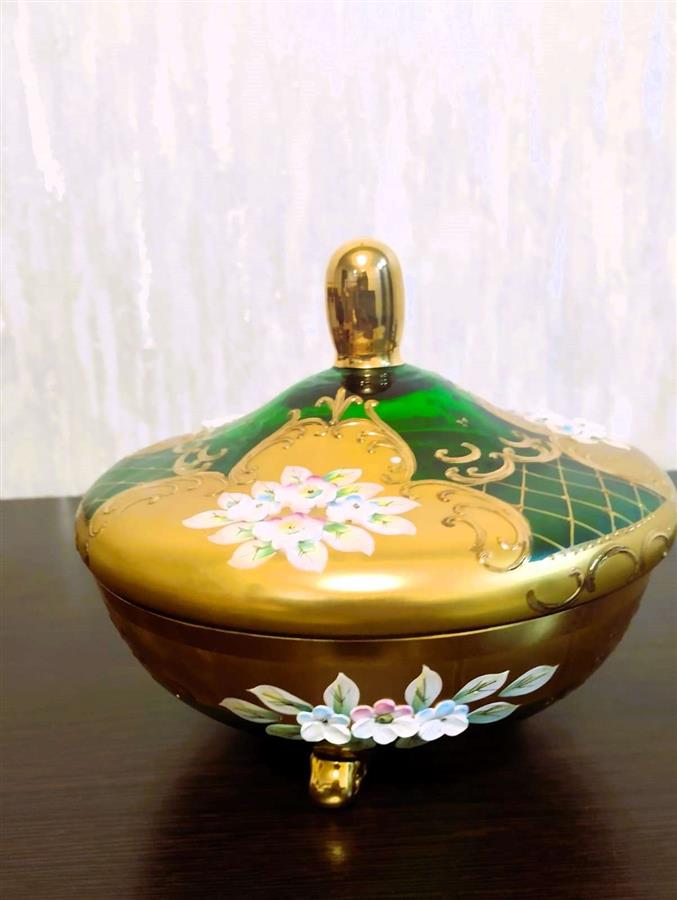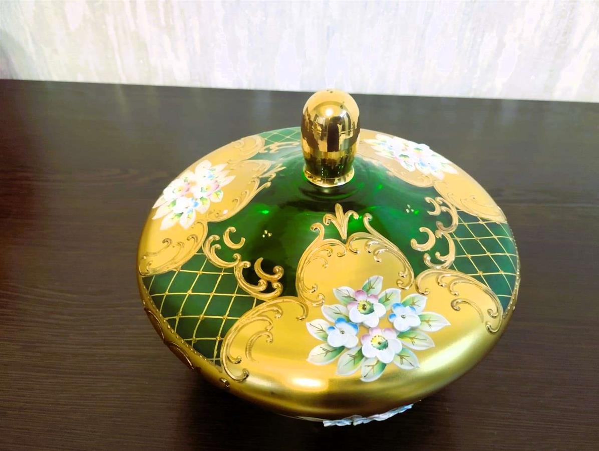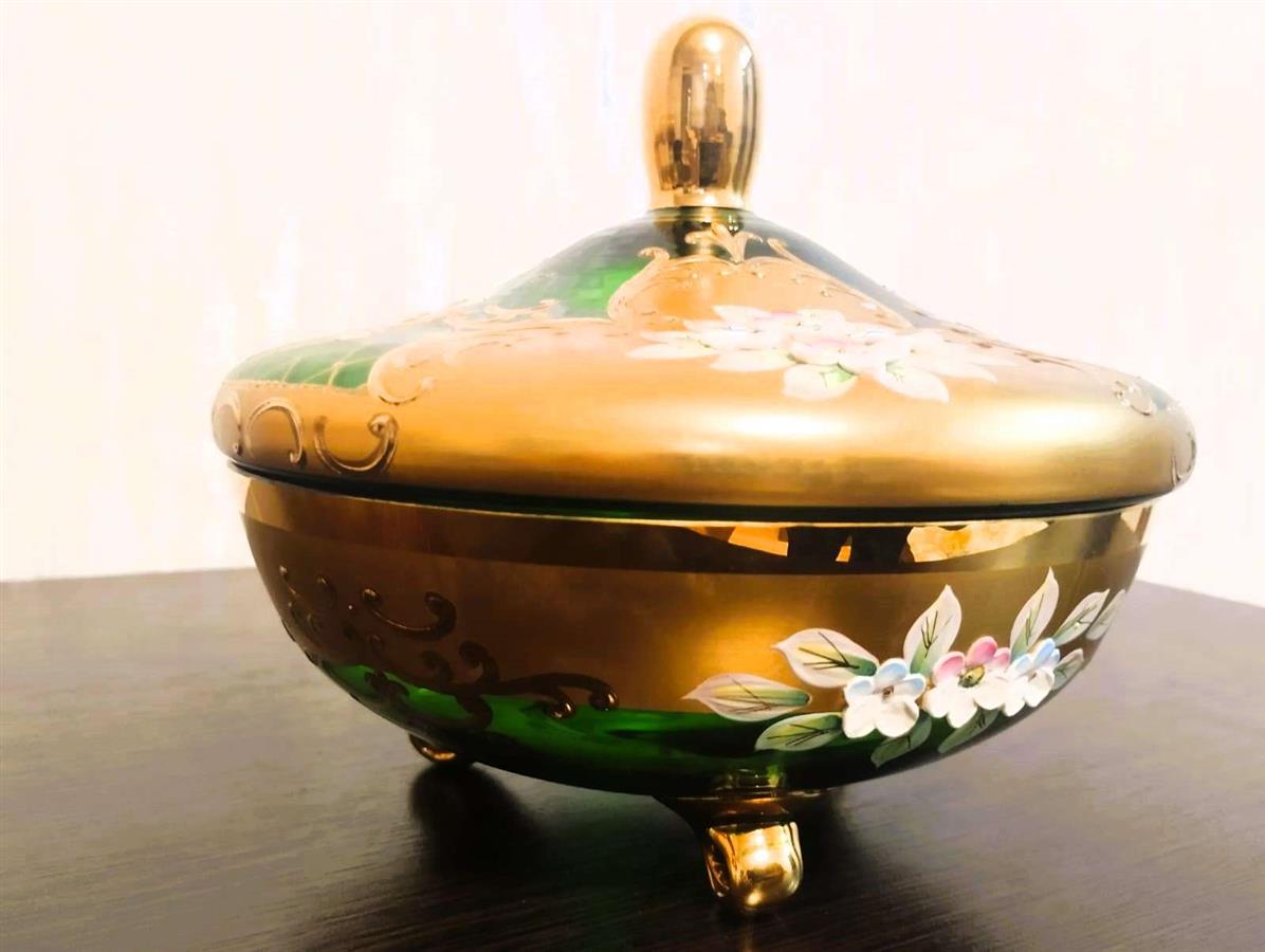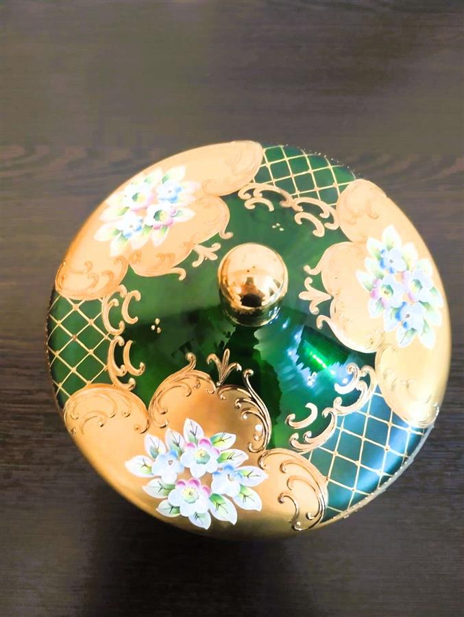 ყიდება ჩეხური წარმოების ბოჰემური შუშის (Bohemia) საკოლექციო ზარდახშა (ბონბონიერა). დამზადებულია მუქი მწვანე ზურმუხტისფერი მინისგან, რომელიც დაფარულია 24-კარატიანი ოქროთი. გაფორმებულია "როკოკოს" სტილის მოცულობითი ხელით ნაძერწი ყვავილებით. არის იდეალურ მდგომარეობაში, ყოველგვარი დაზიანებისა და ოქროს ცვეთის გარეშე. საუკეთესო შენაძენია სამკაულების შესანახად ან საჩუქრად. Show original