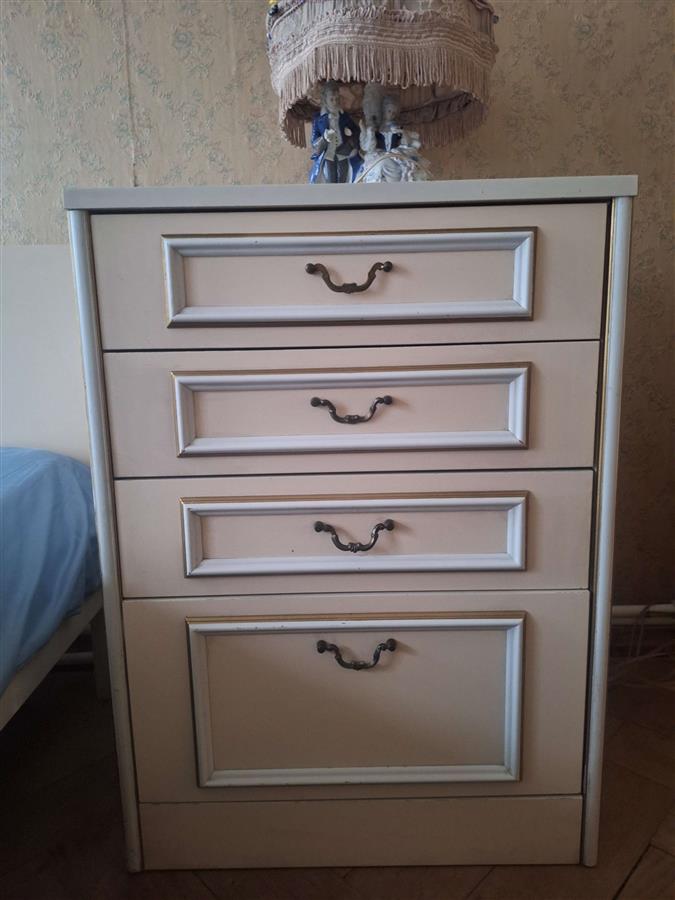 ოჯახიდან /თბილისი/ იყიდება საძინებელი: საწოლი (180x200 სმ), ორი ტუმბო (53x73 სმ), 5-სექციანი ტევადი კარადა, კარადაში ჩაშენებული ტრილიაჟი, სარკე (90x70 სმ). არის კარგი შენახული და ფუნქციონალური, სურვილისამებრ საჭიროებს მცირედ რესტავრაციას. ფასი 2700 ლარი Show original
