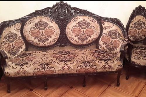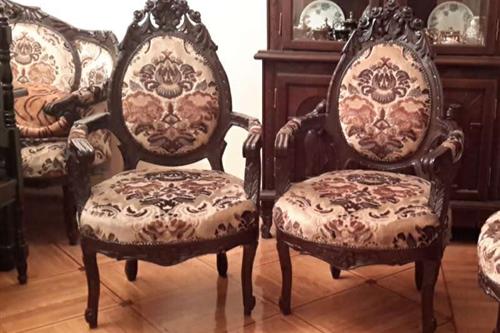 სავარძლები კლასიკური სტილისაა და რბილი, მუქი შინდისფერი ხავერდით არის გადაკრული. ჩარჩო და ფეხები მასიური ხისგანაა დამზადებული.