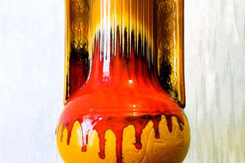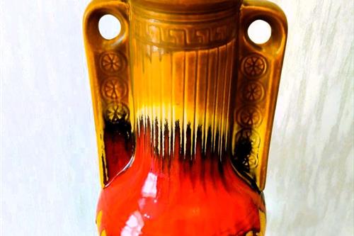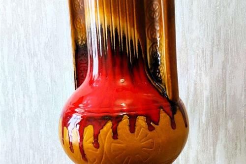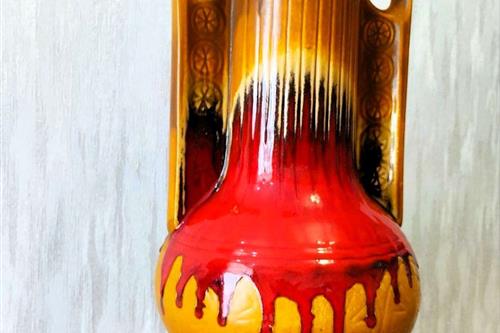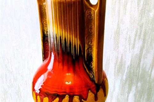 ეს ვინტაჟური კერამიკული ვაზა იუგოსლავიაში KIL-ის (Keramična Industrija Liboje) მიერ დამზადდა. იგი დამზადებულია გამორჩეული „მსუქანი ლავის“ სტილით, რომელიც პოპულარული იყო 1960-იან და 1970-იან წლებში. სათაური: ვინტაჟური KIL Liboje ვაზა (იუგოსლავია), ცხიმიანი ლავის სტილი, 1960-70-იანი წლები. ბრენდი/მწარმოებელი: KIL (Keramična Industrija Liboje), SFRY (იუგოსლავია/სლოვენია). სტილი: რეტრო / შუა საუკუნეების თანამედროვე. ვაზას აქვს შთამბეჭდავი „მსუქანი ლავის“ მინანქარი წითელი, ყავისფერი და შავი ზოლებით. მასალა: მოჭიქული კერამიკა. დიზაინი: ვიწრო ყელი, ორი მასიური სახელური და აწეული გეომეტრიული ან ყვავილოვანი ნიმუში ქვედა ნაწილში. მდგომარეობა: ძალიან კარგ მდგომარეობაში. ზომები: სიმაღლე დაახლოებით 27–28 სმ. Xl ვინტაჟური კილ ლიბოე იუგოსლავია კერამიკული ვაზა / ვინტაჟური ბრტყელი ლავის ვაზა / ვინტაჟური გამხმარი ყვავილების თაიგული / ვინტაჟური იატაკის ვაზა
