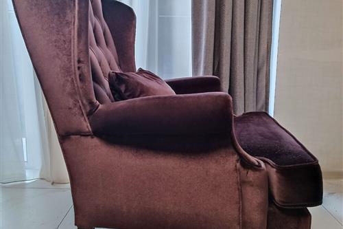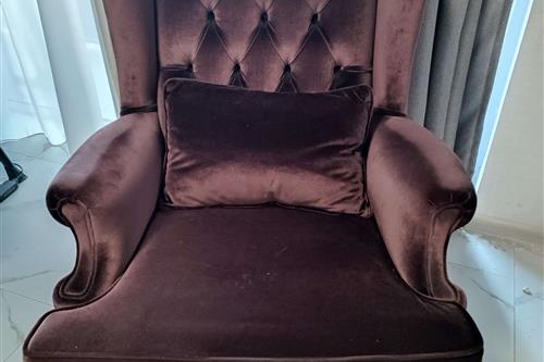 სკამები კლასიკური სტილისაა და რბილი, მუქი შინდისფერი ხავერდით არის გადაკრული. მათ აქვთ მოჩუქურთმებული მყარი ხის ფეხები.