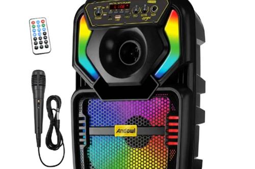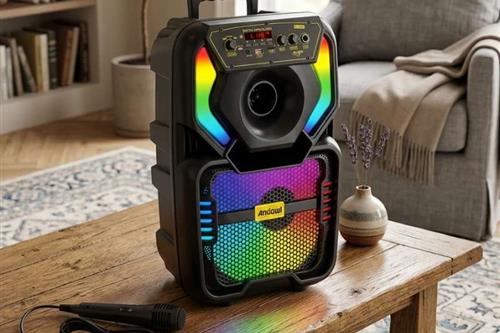 Andowl Q-YX808 არის მძლავრი და პორტატული აუდიო სისტემა, რომელიც შექმნილია წვეულებებისა და კარაოკე საღამოებისთვის. მისი 8-დიუმიანი დინამიკი უზრუნველყოფს ხმამაღალ და სუფთა ჟღერადობას, ხოლო მრავალფეროვანი RGB განათება იდეალურ სადღესასწაულო ატმოსფეროს ქმნის. კომპლექტში შემავალი სადენიანი მიკროფონი და დისტანციური პულტი მაქსიმალურად კომფორტულს ხდის მის გამოყენებას ნებისმიერ გარემოში. რატომ უნდა აირჩიოთ Andowl Q-YX808? უფასო მიწოდება თბილისი რუსთავი იმავე დღეს რეგიონებში 2-4 სამუშაო დღეში 8-ინჩიანი საბვუფერი: გამოსცემს საკმაოდ მძლავრ და ღრმა ბასს. TWS (True Wireless Stereo): ეს ფუნქცია საშუალებას გაძლევთ უსადენოდ დააკავშიროთ ორი Andowl Q-YX808 ერთმანეთს და მიიღოთ უფრო ძლიერი სტერეო ჟღერადობა. Bluetooth 5.0: სწრაფი და სტაბილური კავშირი სმარტფონთან 10 მეტრის რადიუსში. მულტიმედიური მხარდაჭერა: დაუკავშირეთ USB ფლეშ მეხსიერება, TF ბარათი ან გამოიყენეთ AUX პორტი ნებისმიერი მოწყობილობისთვის. ინტეგრირებული FM რადიო: მოუსმინეთ საყვარელ რადიოსადგურებს პირდაპირ დინამიკიდან. პორტატულობა: მსუბუქი კონსტრუქცია (1.5 კგ) და მოსახერხებელი სახელური აადვილებს მის გადაადგილებას. ტექნიკური მონაცემები: ბრენდი: Andowl მოდელი: Q-YX808. დინამიკის ზომა: 8 ინჩი. გამომავალი სიმძლავრე: 10W. ბლუთუზ ვერსია: 5.0 ბატარეა: 3.7V / 2000mAh (მუშაობის დრო 2 საათზე მეტი). კავშირის პორტები: USB, TF (Micro SD) ბარათი, FM, AUX, TWS. ზომები: 250 x 210 x 385 მმ. წონა: 1.5 კგ (ნეტო). კომპლექტაცია: Andowl Q-YX808 დინამიკი. სადენიანი მიკროფონი. დისტანციური მართვის პულტი. USB დამტენი კაბელი.