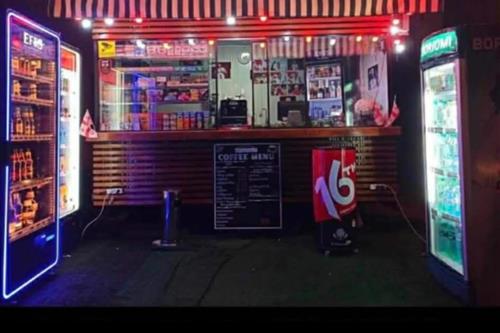 ჯიხური ჩასაბმელით ბორბლებზე,ავეჯით,ხელსაბანით,შუშის თაროებით განათებით,კამერებით, ინვენტორული კონდიციონერი,რეკლამით,დივანკრესლო,სკამები, ბლენდერი,ყინულის აპარატი