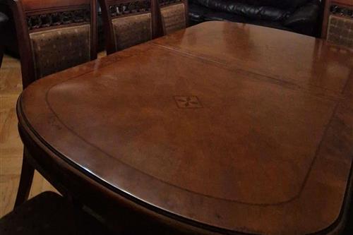სავარძლები კლასიკური სტილისაა და რბილი, მუქი შინდისფერი ხავერდით არის გადაკრული. ფეხები ჩუქურთმებული მასიური ხისგანაა.
