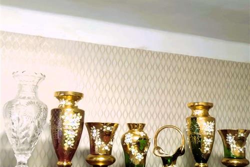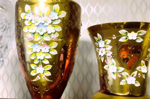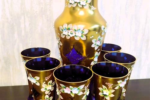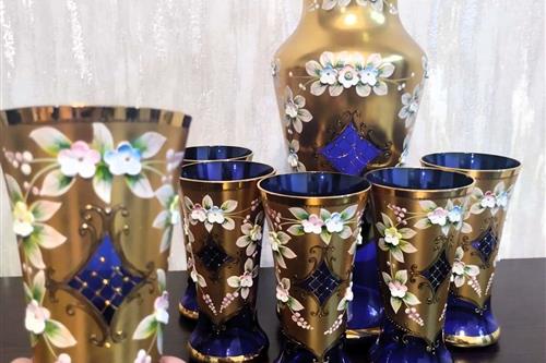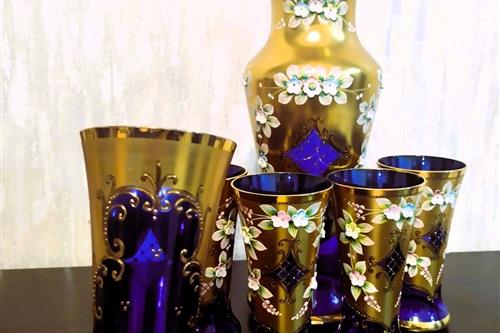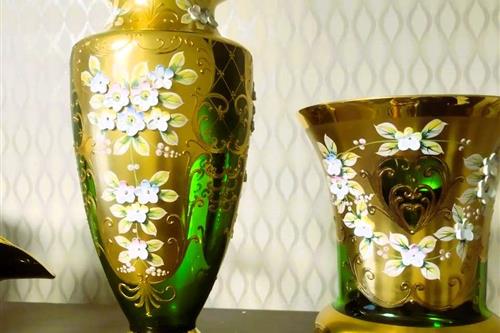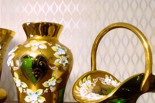 მასალა: ორშრიანი ზურმუხტისფერი მინა (ბოჰემური კრისტალი), მდიდარი 24 კარატიანი ოქროს მოოქროვილი.